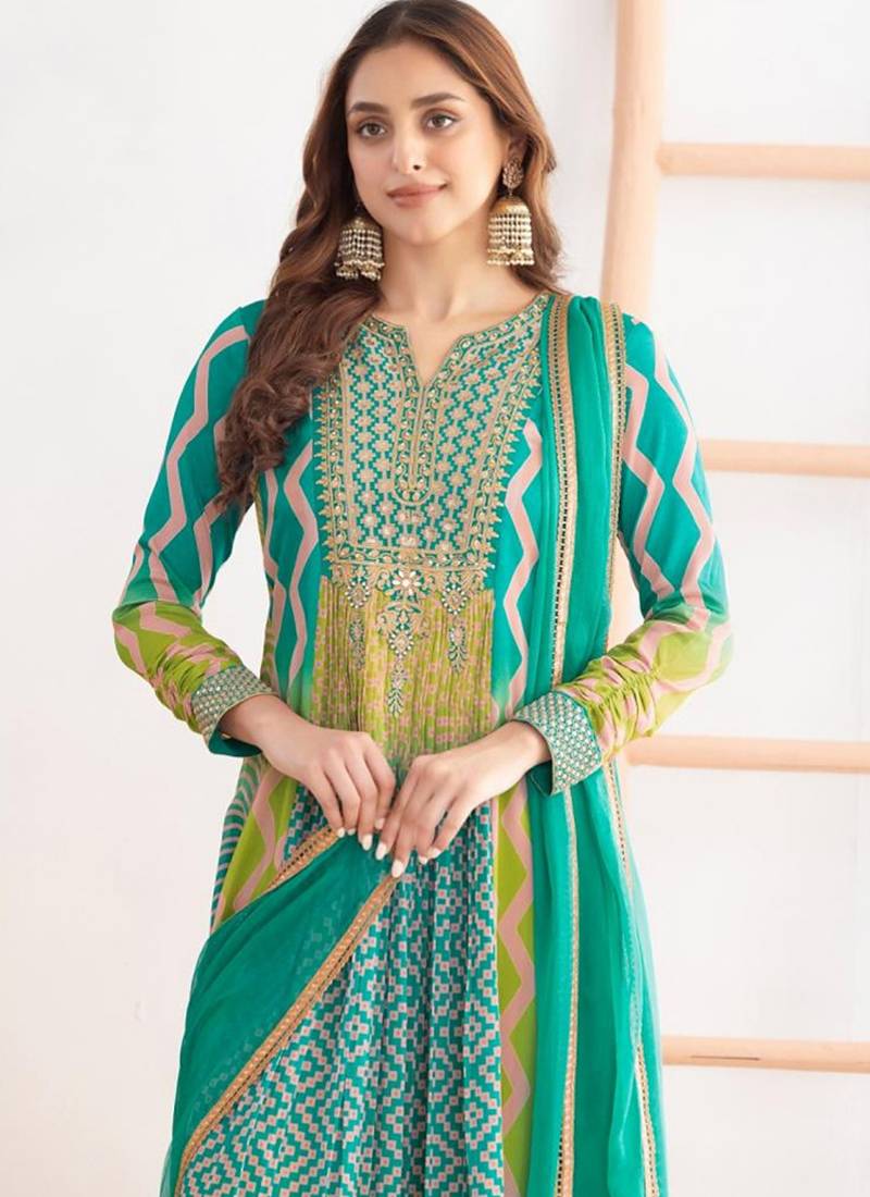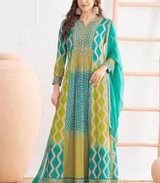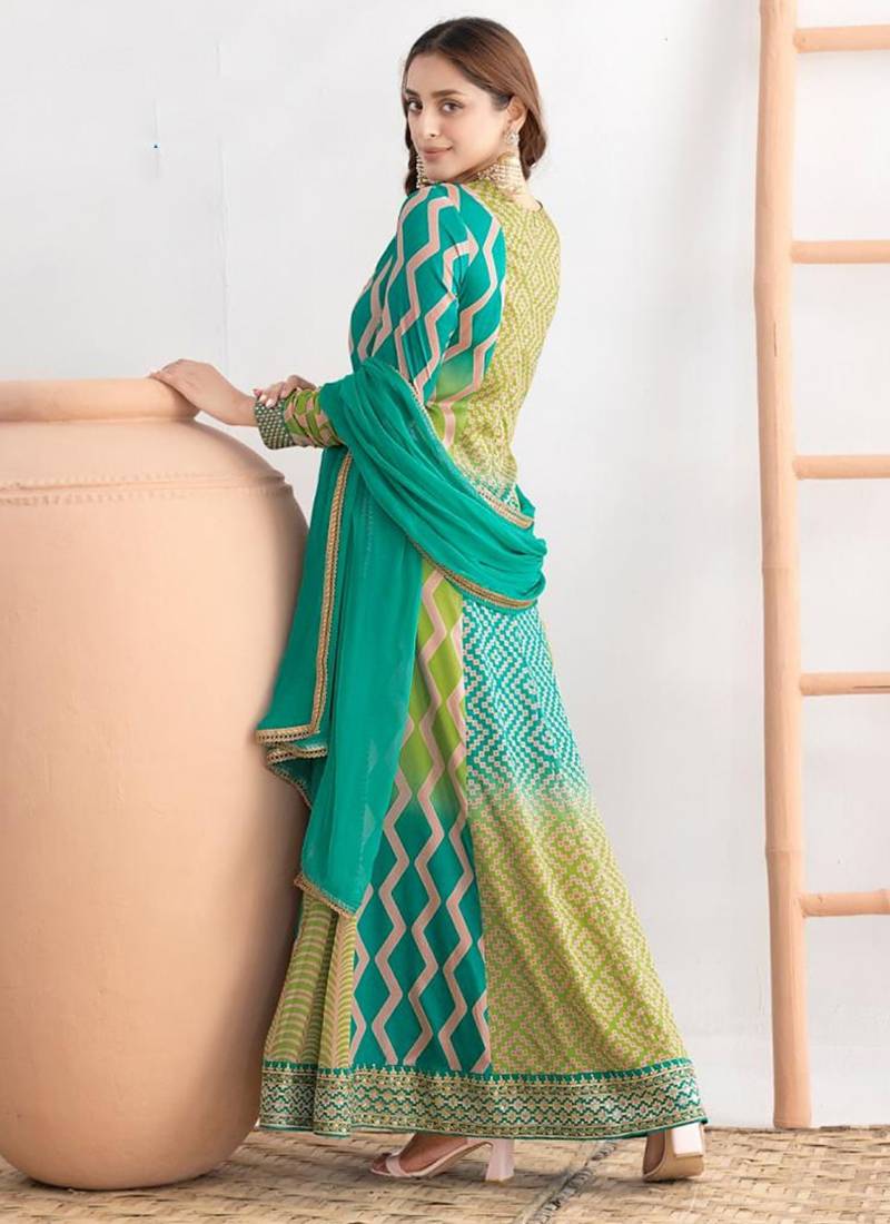 | Product Description | A Vibrant Turquoise And Green Chinon Anarkali Top Set With Dabka Dori, Resham,Leheriyu Print Work, Styled With Chinon Dupatta. A Strong Color Pop Festive Option With Minimal Fuss |