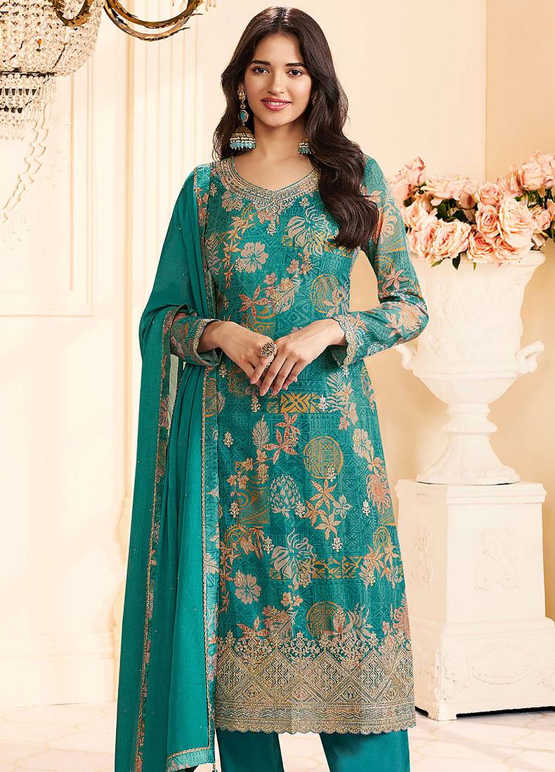 | Product Description | Crafted In Chinon Fabric This Turquoise Features Minimal Digital Print Detailing. Designed With A Round Neckline, Full Sleeves, It Is Paired With Straight Fit Mid Waist Pant And A Matching Dupatta—Ideal For Festive And Pooja Occasions. |