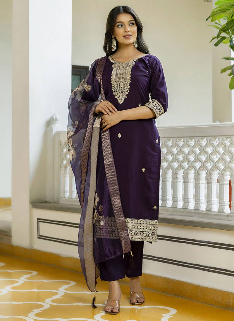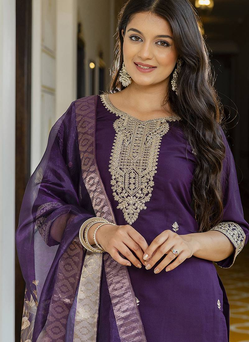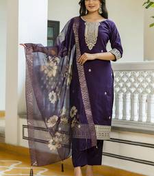 Viscose chanderi embroidered suit in purple stitched