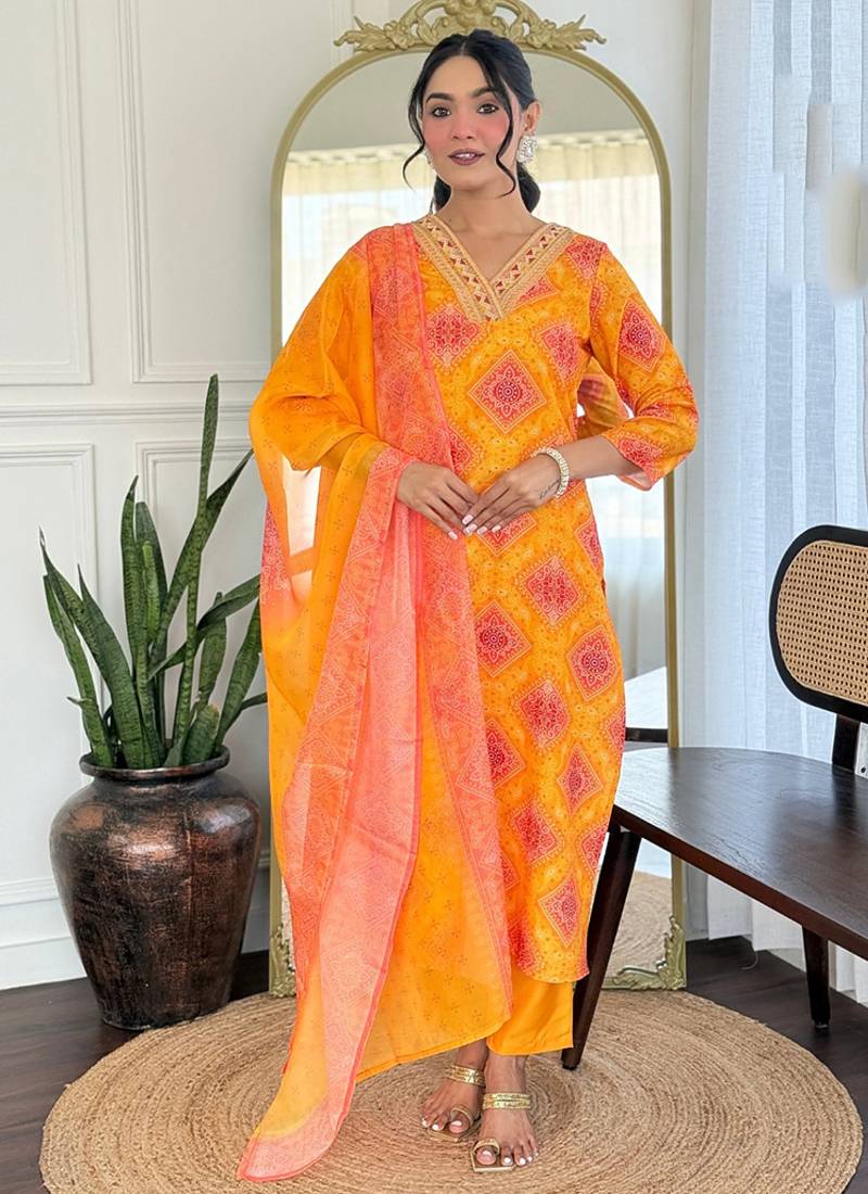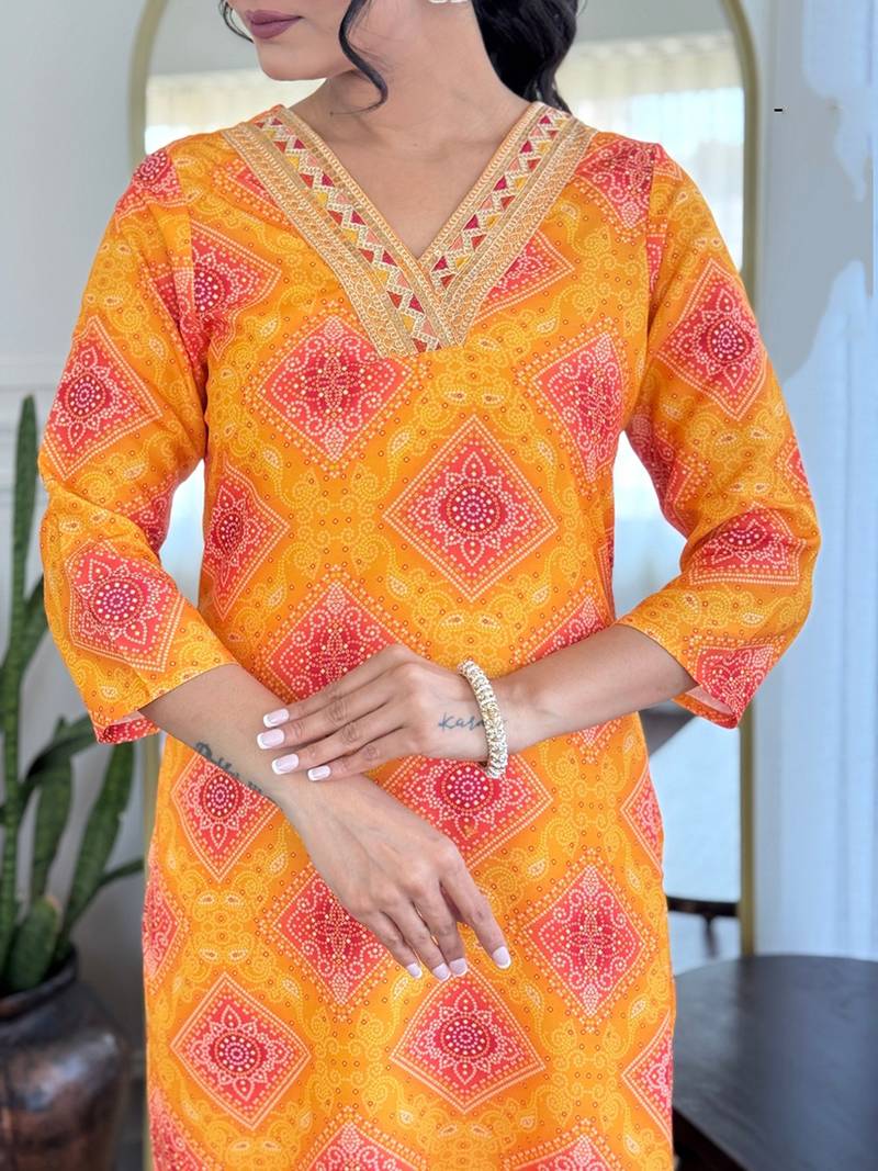 | Product Description | Crafted In Rich Yellow Rayon This Minimal Festive Set Features An Asymmetric Knee Length Short Enhanced With Thread And Sequin Work. Designed With A V Neckline And 3/4th Sleeves, It’s Paired With Straight Pants And A Lightweight Taby Dupatta To Complete The Look. |