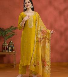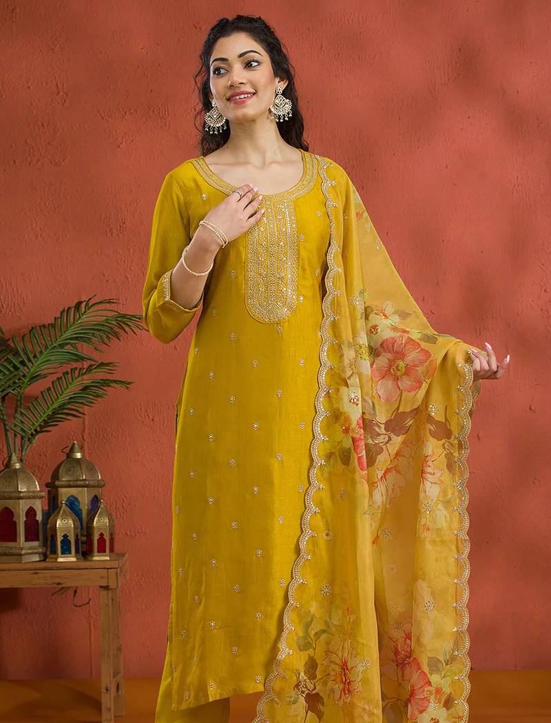 A Festive Yellow Suit In Vichitra Silk Styled With A Embroidered Sequince Kurta, Round Neckline, And Matching Pant With Organza Dupatta. The Quarter Sleeves Lend This Outfit A Boho Flair Perfect For Festive Pooja Events.