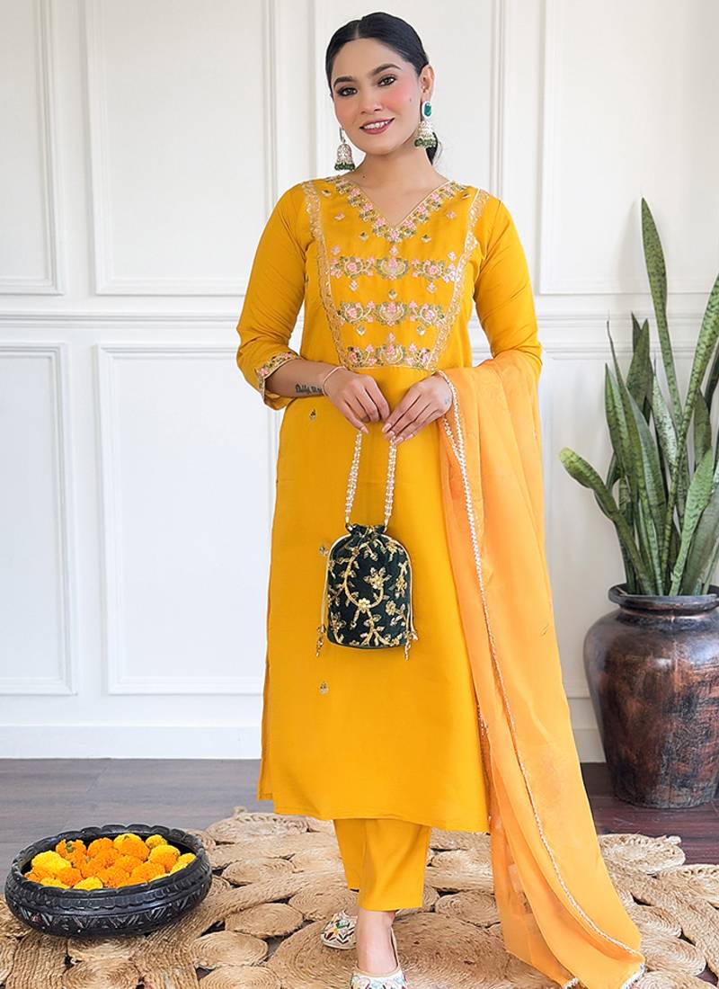 | Product Name | Yellow Viscose Chanderi Sttiched Suit | |