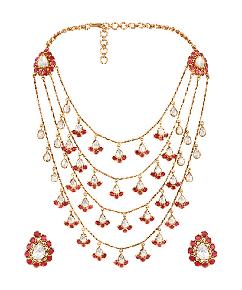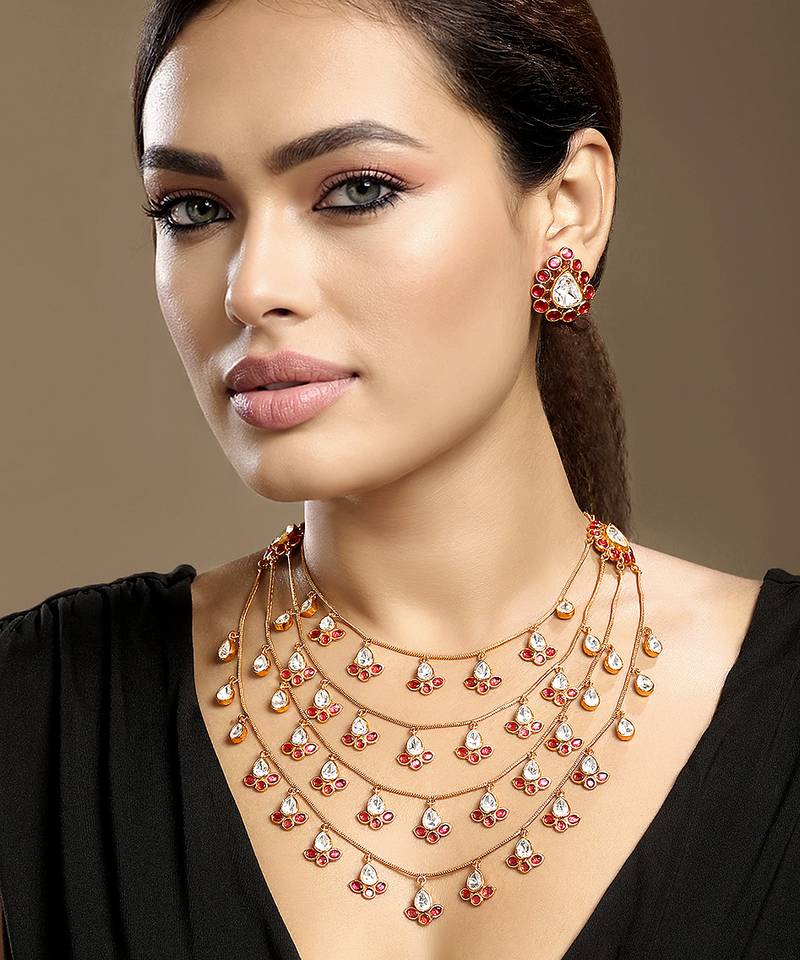 | Product Description | Make A Grand Style Statement With This Gold Plated Kundan Red Stones Multi Layered Necklace Set. Designed With Cascading Layers And Vibrant Red Stones, It Showcases Exquisite Traditional Craftsmanship. Perfect For Weddings, Festive Celebrations, Or Special Occasions, This Opulent Set Adds Depth, Elegance, And Royal Charm To Your Ethnic Attire.