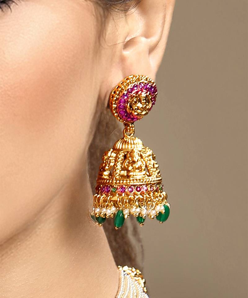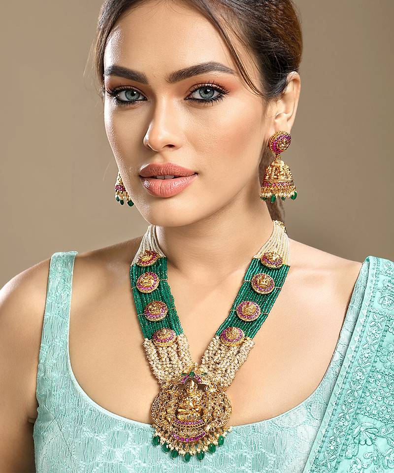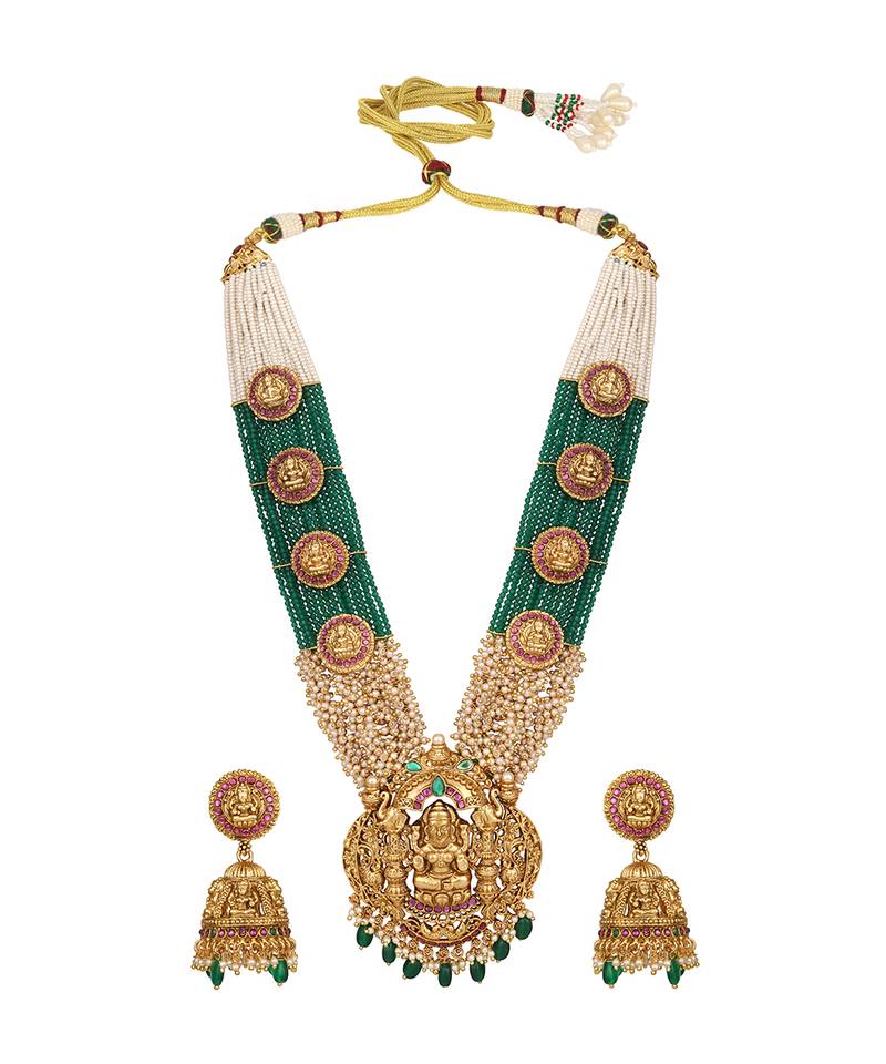| Product Name | Gold Plated Temple Green Stone Long Necklace Set | |