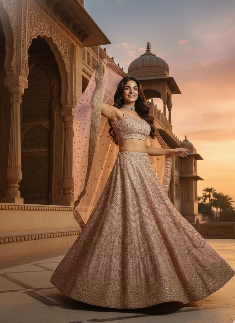 | Product Description | This Baby Pink Lehenga Choli Set Features A Satin Silk Lehenga Designed With Sequin, Dori, And Zari Work, As Shown In The Product Image. The Lehenga Offers A 3.5 Meter Flare And Includes Can Can Attachment For Structured Volume. It Is Paired With An Unstitched Satin Silk Blouse Detailed With All Over Sequin, Dori, And Zari Work On Both The Front And Back. The Set Is Completed With A Net Dupatta Featuring Matching Sequin, Zari, And Dori Embellishment. The Fabric Texture, Embroidery Placement, And Overall Finish Align With The Product Visuals. |