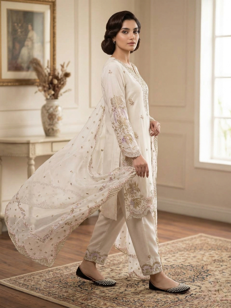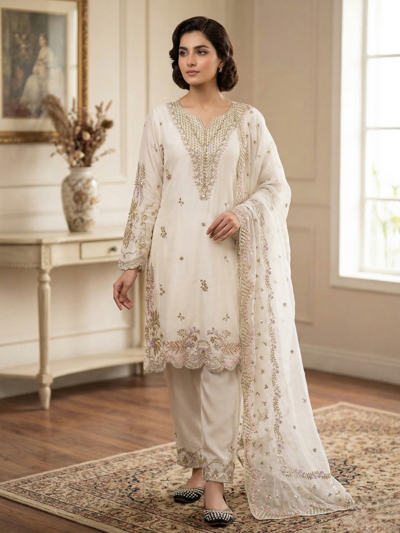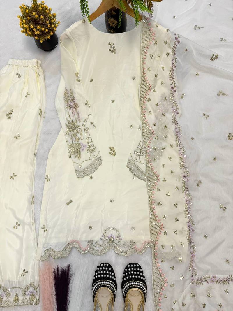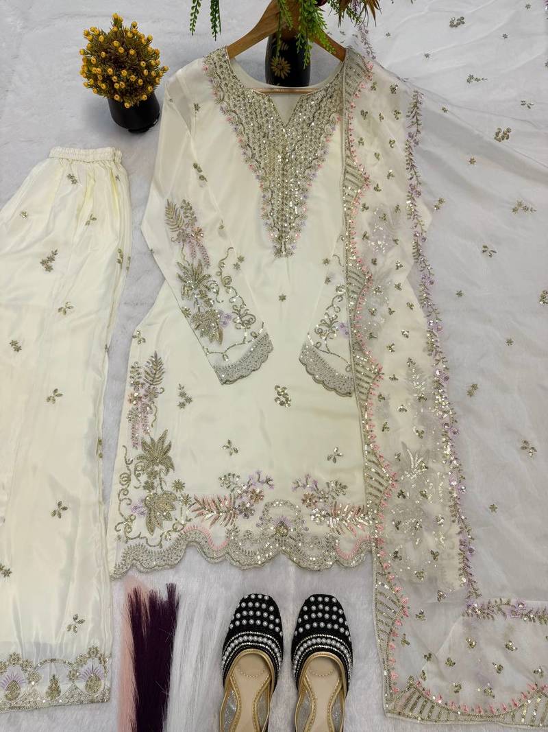 | Product Name | Cream Natural Crep Silk Palazzo Suit With Embroidery And Multi Needle Sequence Work | |