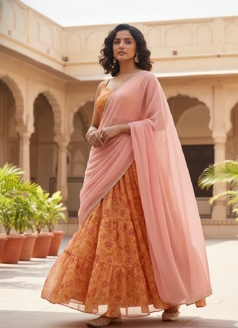 | Product Description | Make An Elegant Statement With This Mustard Yellow Organza Lehenga Set, Featuring A Beautifully Printed Skirt And Choli Paired With A Matching Dupatta. The Soft Organza Fabric Offers A Smooth, Flowy Silhouette That Moves Beautifully, While The Vibrant Print Adds Life And Charm To The Ensemble. Perfect For Festive Celebrations, Cultural Events, And Grand Occasions, This Set Blends Traditional Style With Modern Appeal. Its Coordinated Print And Refined Finish Make It A Lovely Choice For Anyone Looking To Stand Out With Effortless Style. |