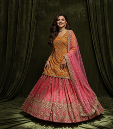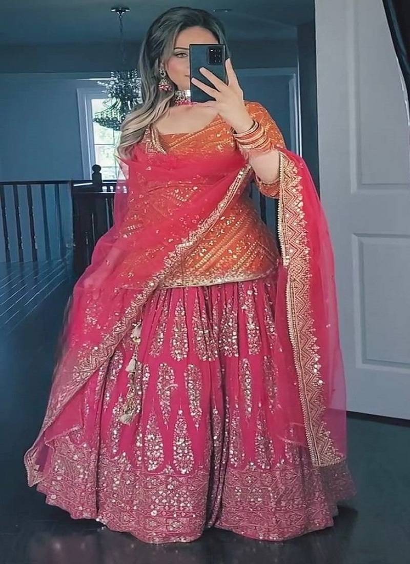 | Product Description | This Elegant Lehenga Choli Set Features A Orange Long Embroidered Blouse Paired With A Rich Pink Flared Skirt And Matching Dupatta. Crafted With Intricate Sequin And Thread Detailing, It Offers Comfort And Luxury. Perfect For Weddings, Festive Celebrations, And Special Occasions With Timeless Ethnic Charm Lehenga Fabric : Faux Georgette