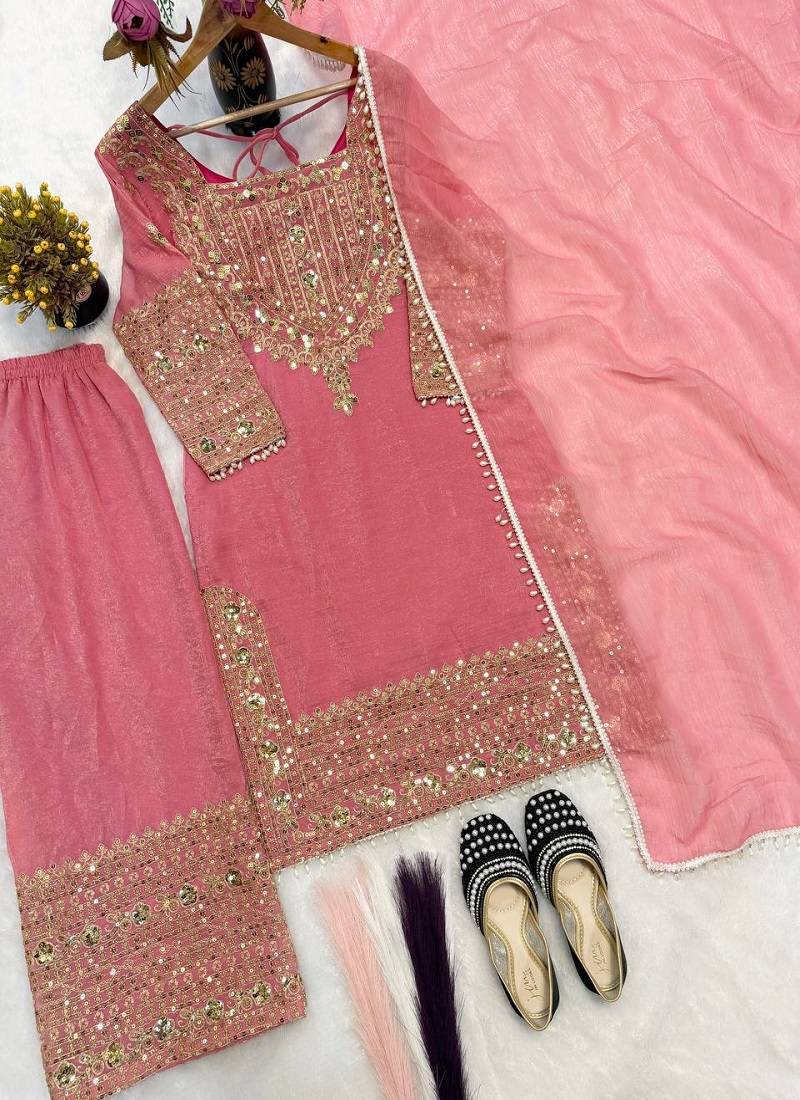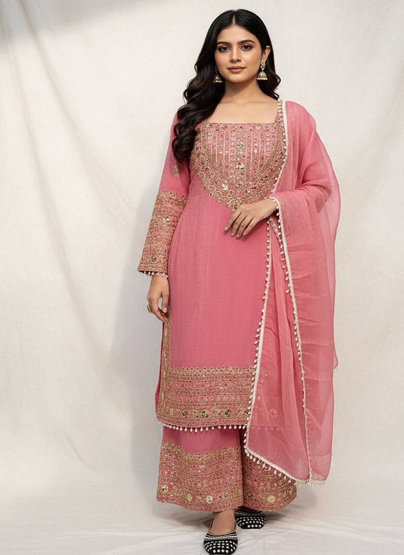 | Product Description | Pink Crunchy Silk Salwar Suit With Detailed Embroidery Work Across The Top And Lower Portion. The Set Includes A Kameez With Visible Thread Embroidery Forming Patterned Motifs And Matching Salwar Bottom. The Fabric Surface Shows A Smooth Crunchy Silk Weave With Tonal Stitching. The Neckline And Sleeve Edges Feature Consistent Embroidery Placement, And The Silhouette Shows A Straight Cut Kameez With Full Length Bottom. Visible Seam Lines And Stitch Placement Reflect Garment Construction. The Design Appears Balanced With Embroidery Focused On Key Sections Of The Suit. |