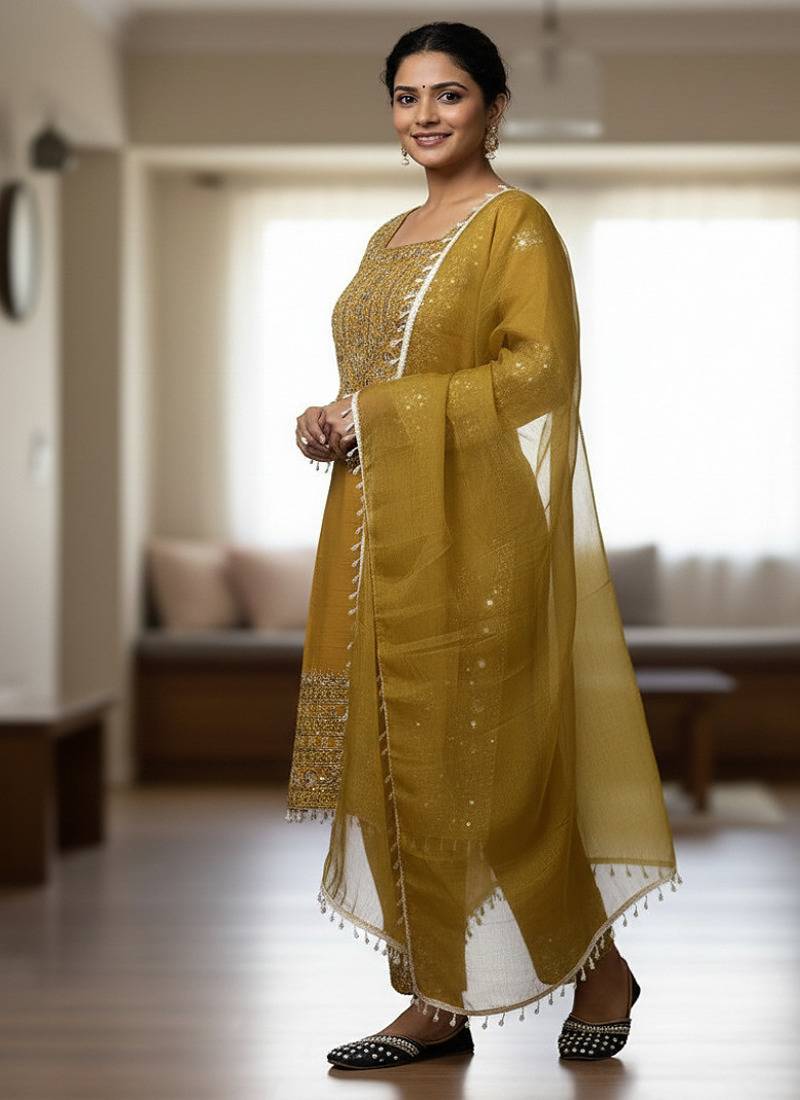 This Yellow Salwar Suit Is Crafted In Crunchy Silk And Features Detailed Embroidery Work On The Kurta And Bottom. The Neckline And Upper Bodice Are Decorated With Dense Thread Embroidery Arranged In Vertical And Geometric Patterns. The Hemline Of The Kurta Includes A Coordinated Embroidered Border That Complements The Overall Design.
