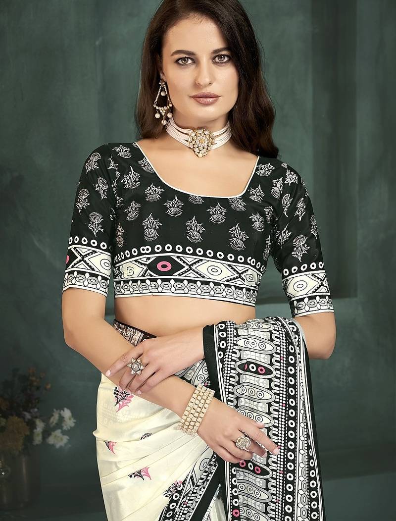 White or foil premium printed saree with blouse