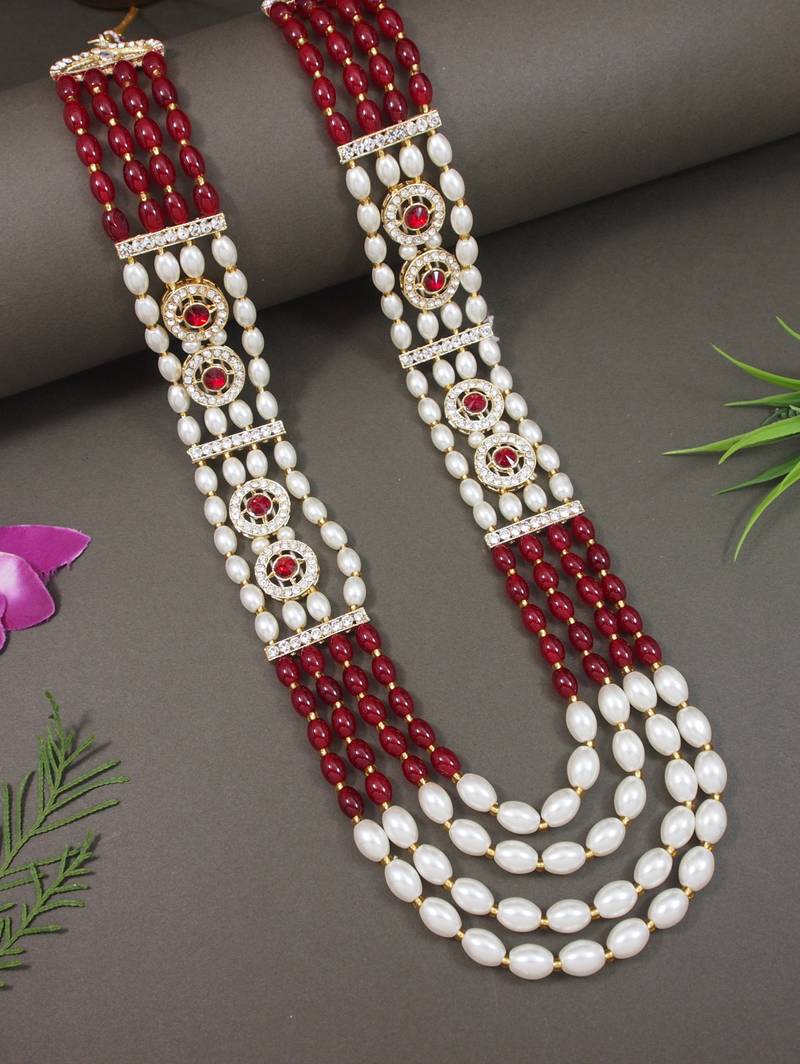 4 layered traditional gold plated dulha moti mala with beaded maharaja haar::Groom necklace for men (maroon)