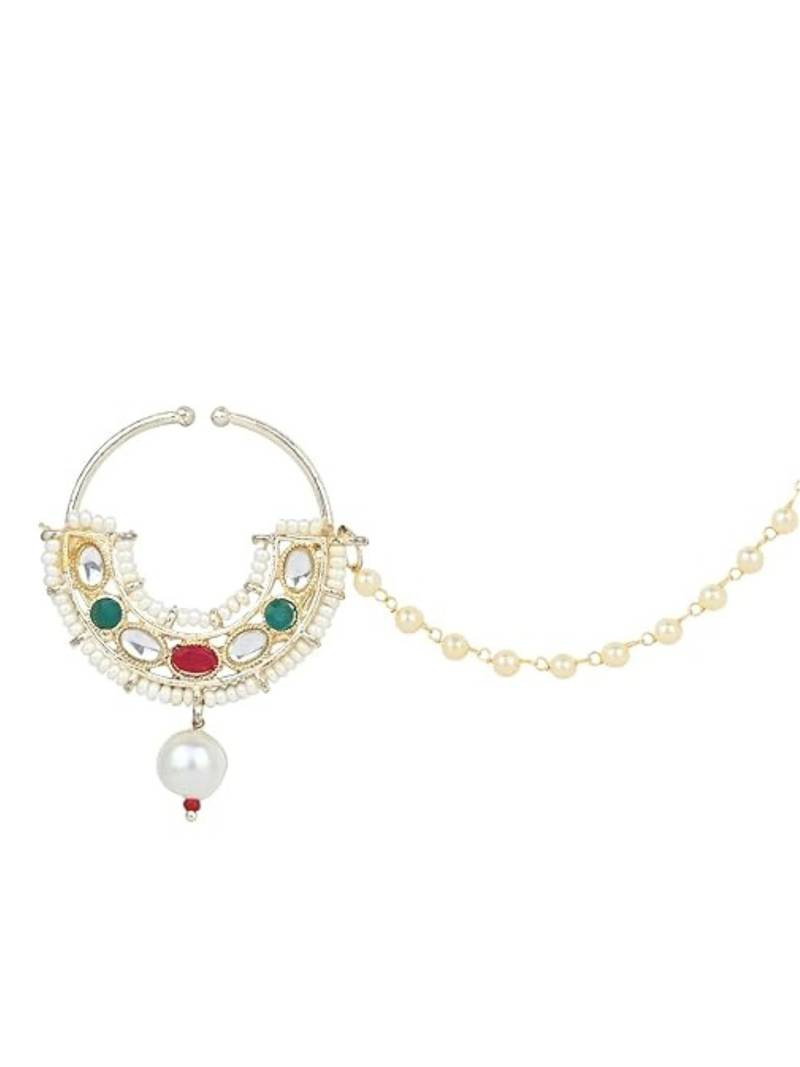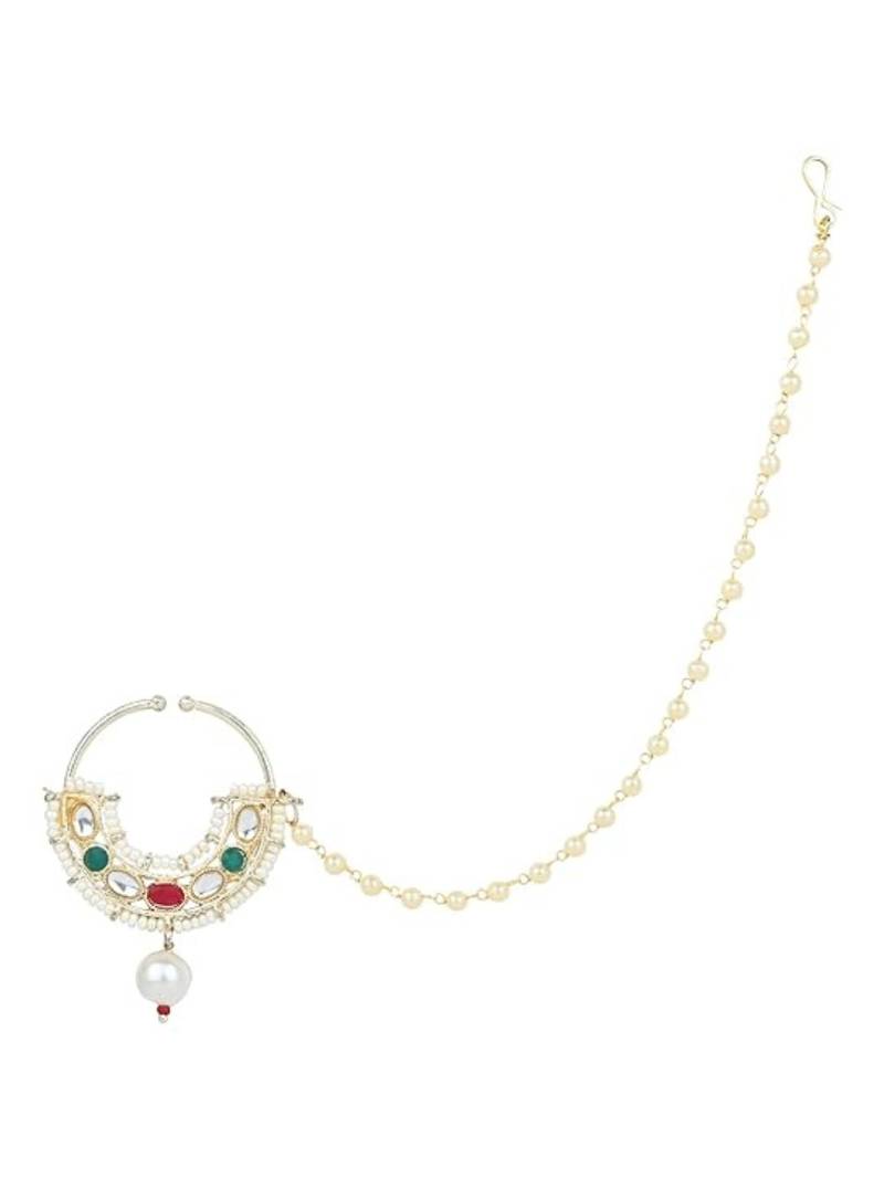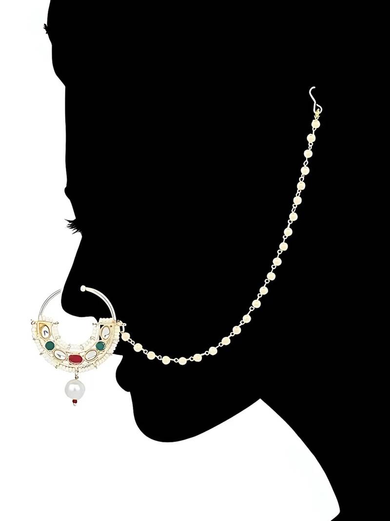 Ethnic Bridal Nose Ring/Nath Without Piercing With Pearl Chain Encased With Pearl Stone For Women
