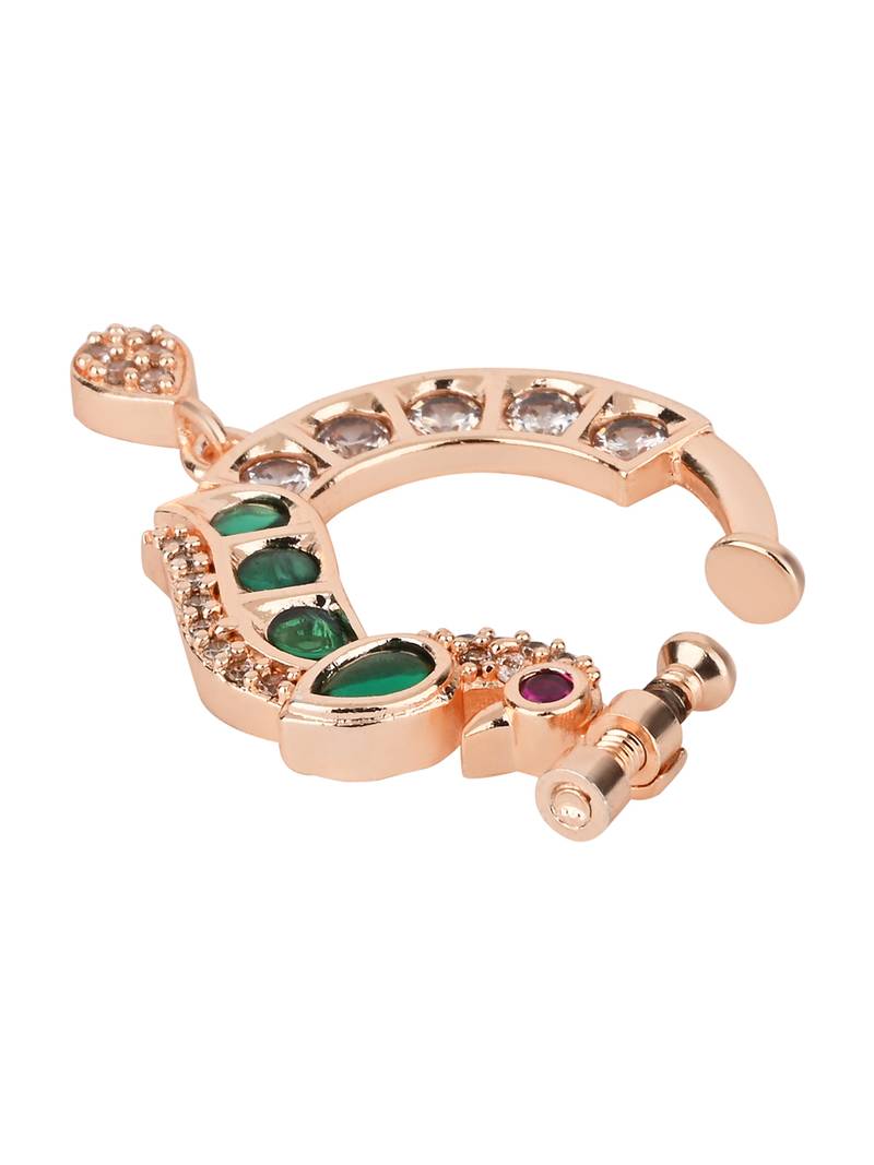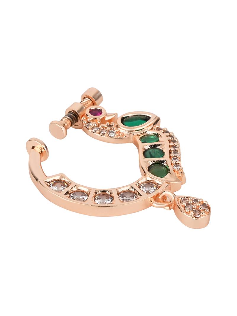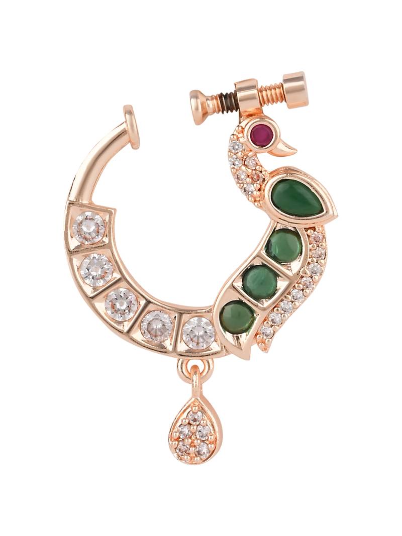 Peacock design cz american diamond non-piercing screw press nose pin::Nath clip on for women