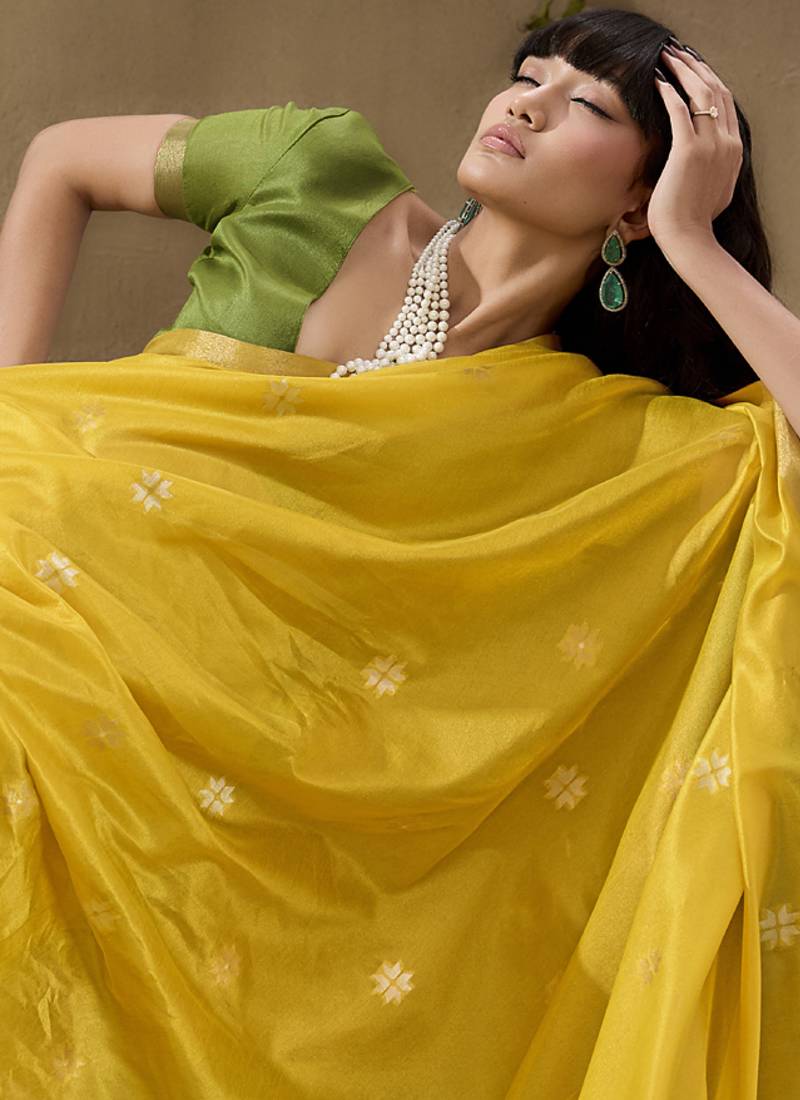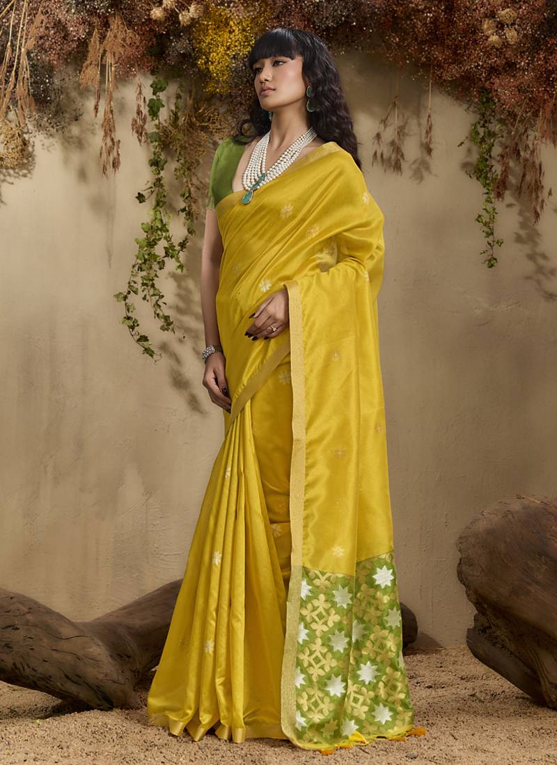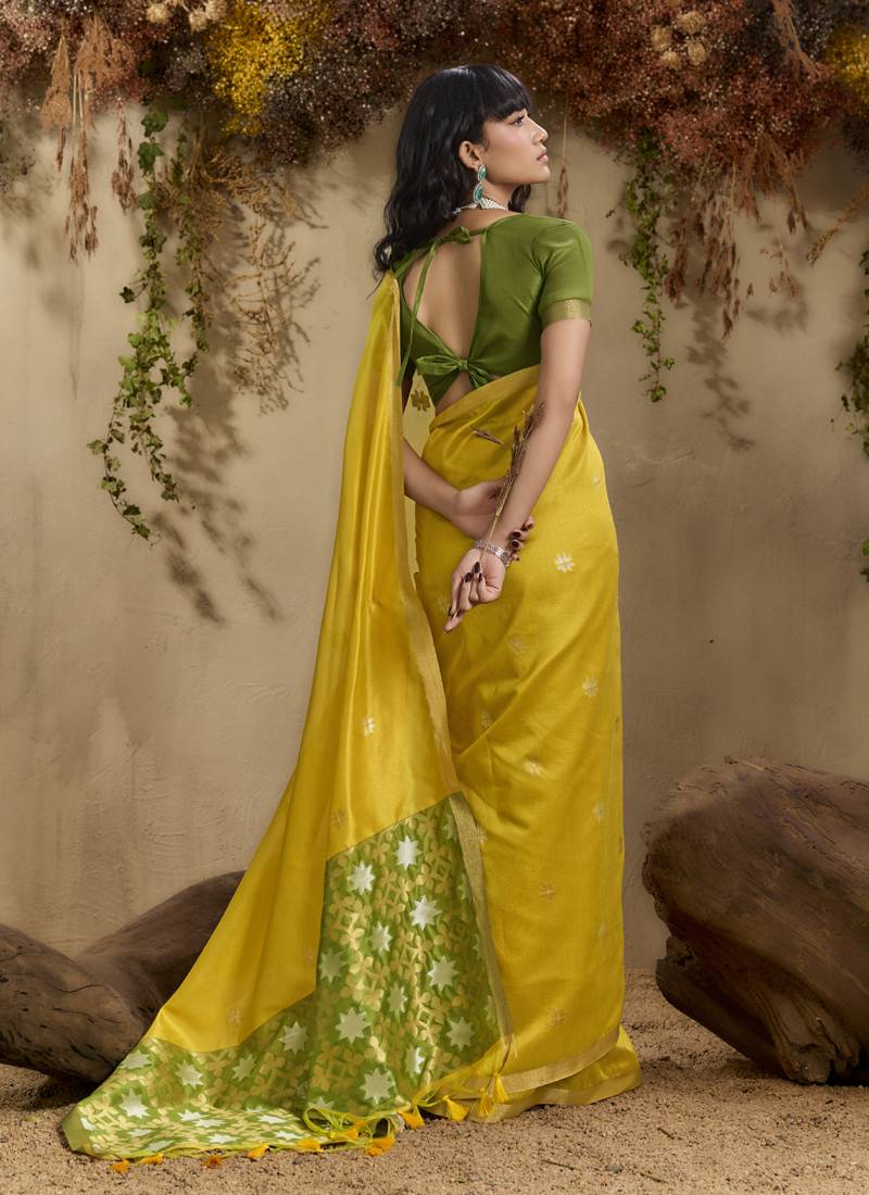 Lemon yellow patola tussar silk handloom weaving saree
