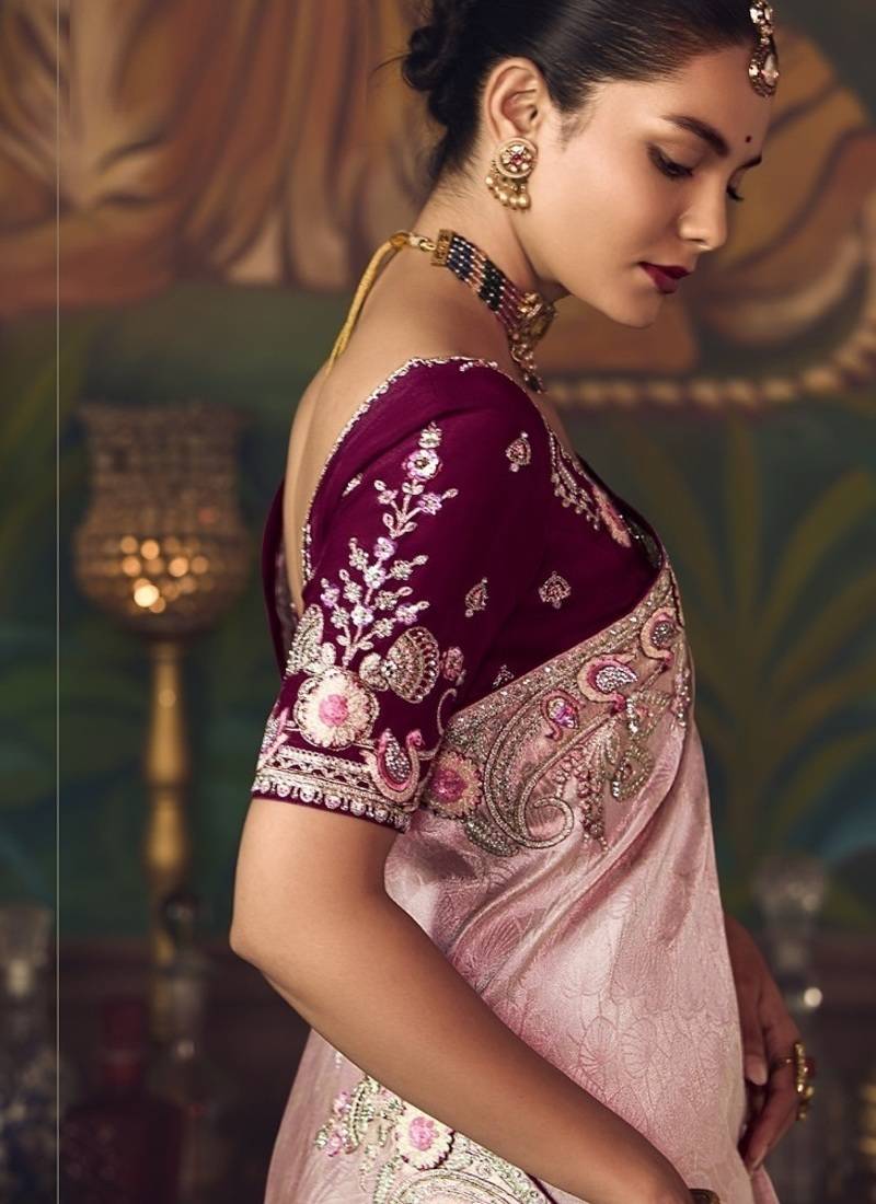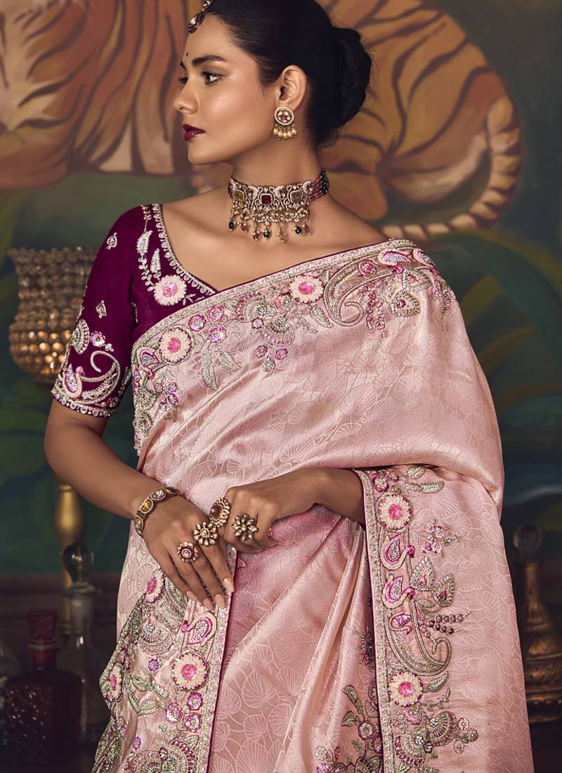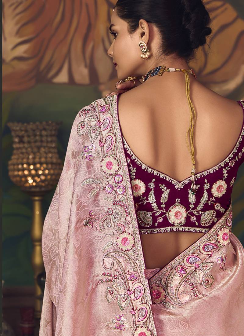 Light baby pink silk blend with heavy embroidery work wedding wear designer saree