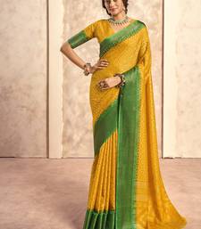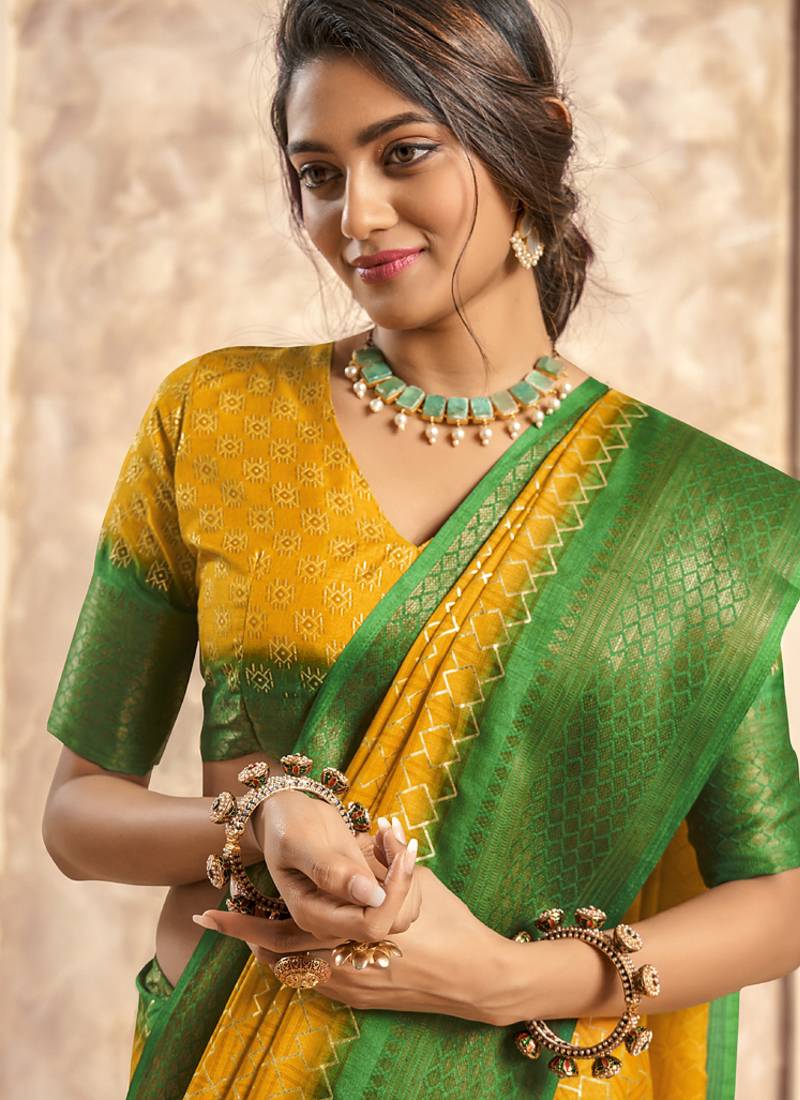 | Product Name | Mustard With Green Border Art Silk Blend With Foil Print Casual Wear Saree | |