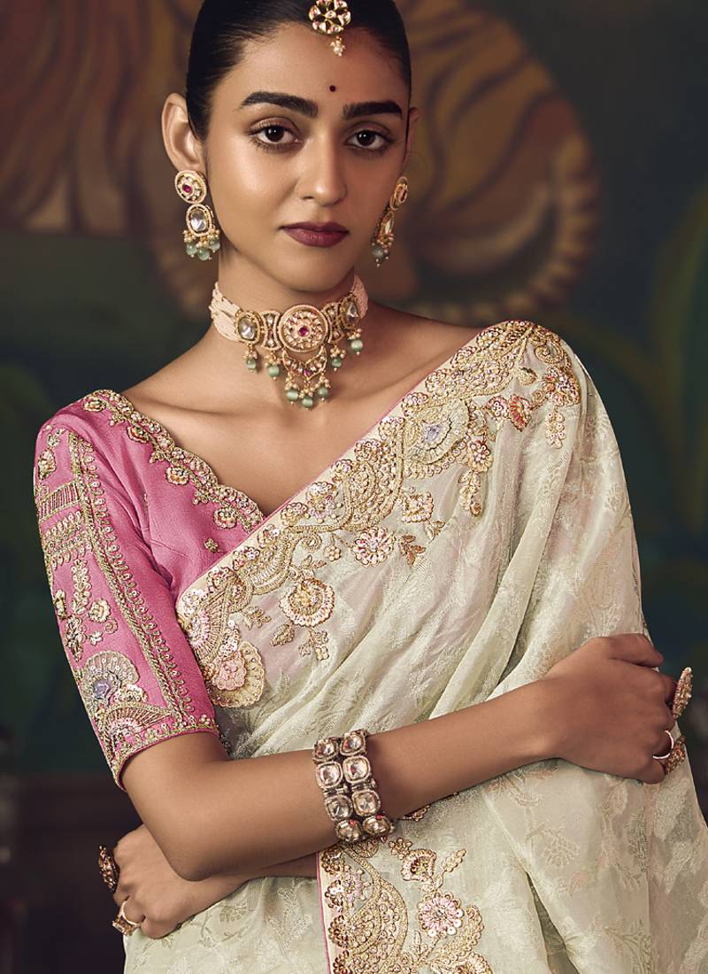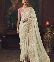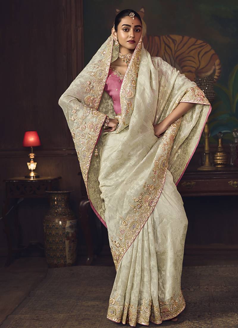 Off white silk blend with heavy embroidery work wedding wear designer saree