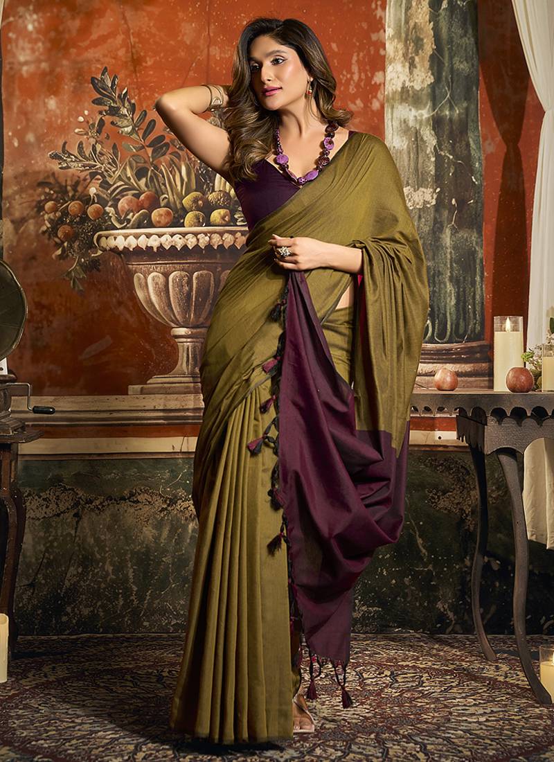 Olive mal cotton contrast pallu fancy tassels saree