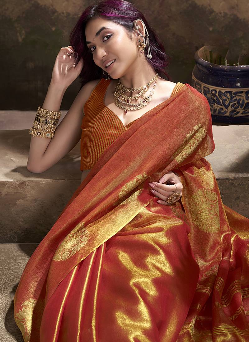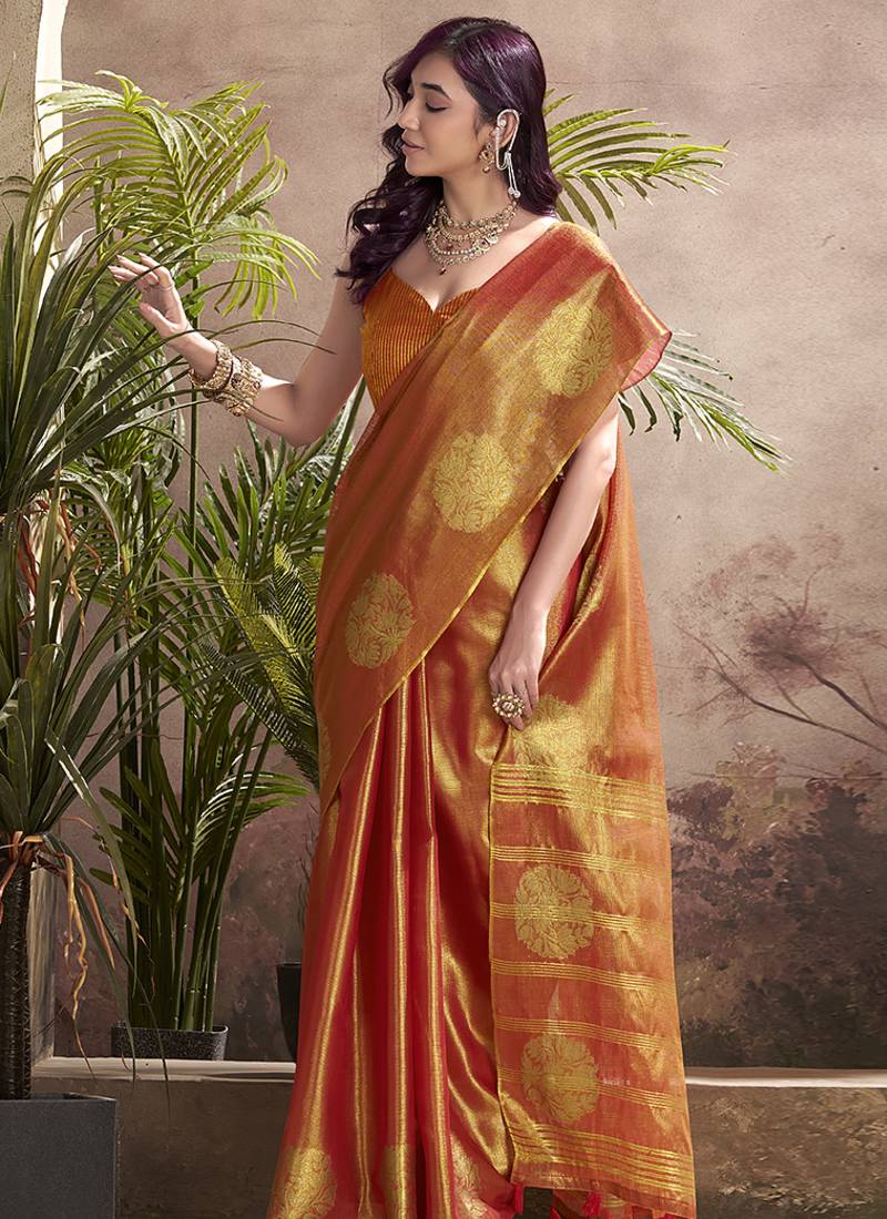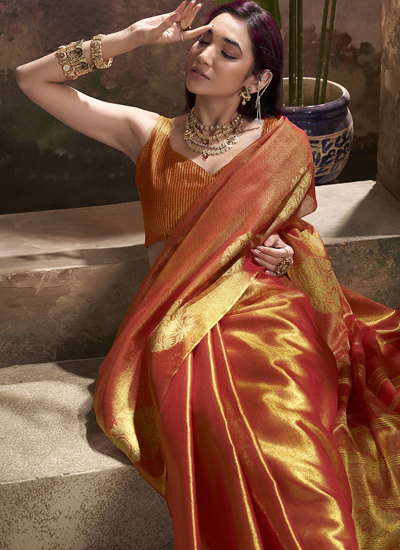 Orange kiri silk blend zari weaving party wear saree