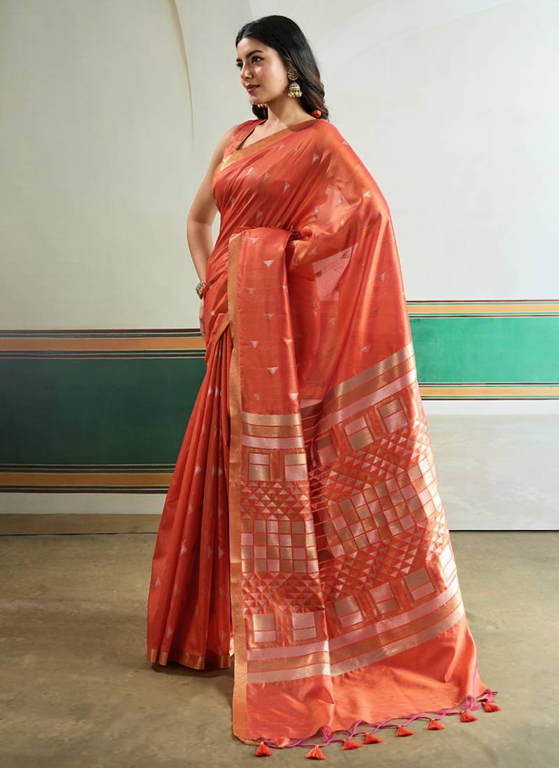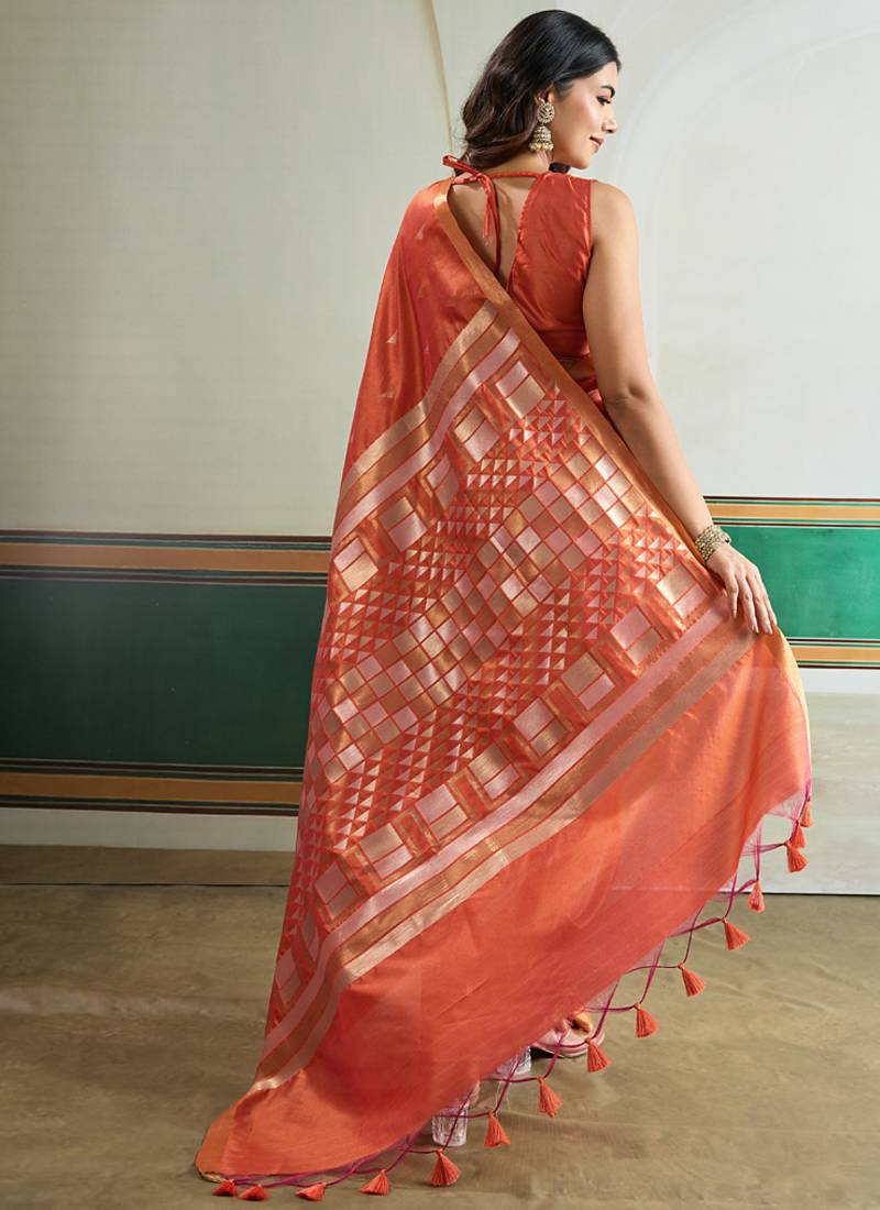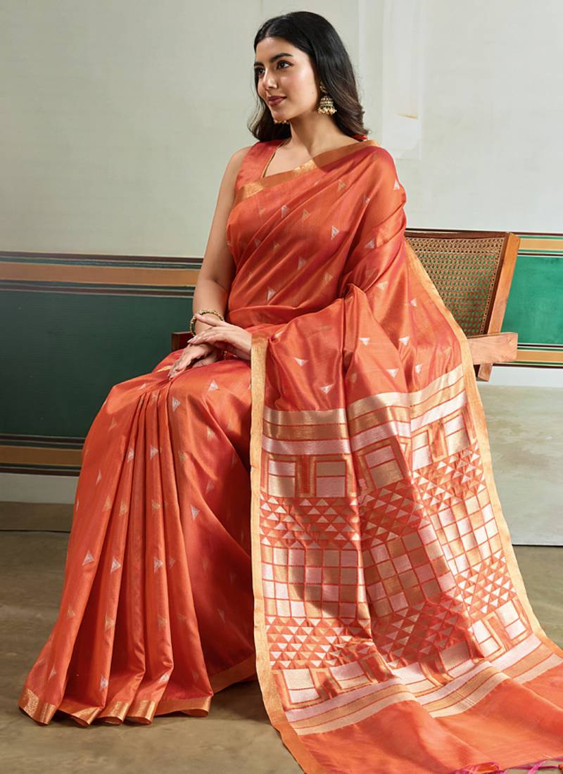 Orange silk blend weaving handloom festival wear saree