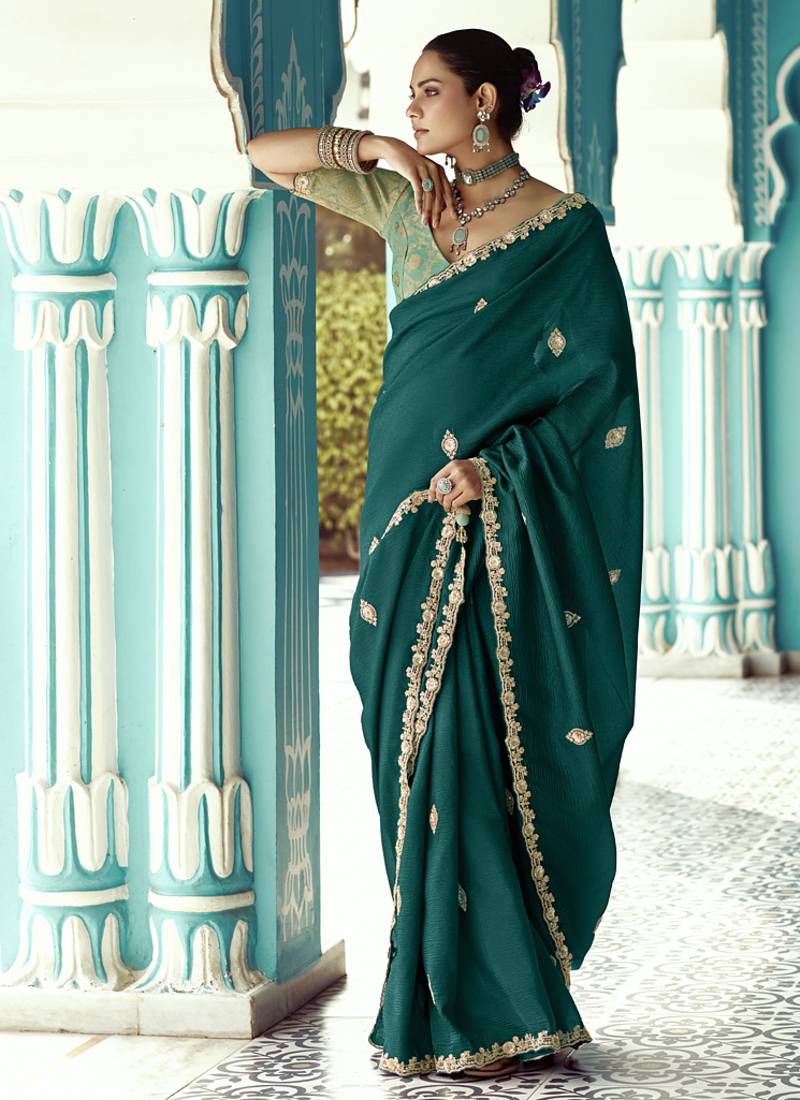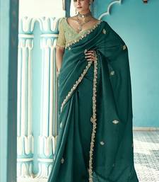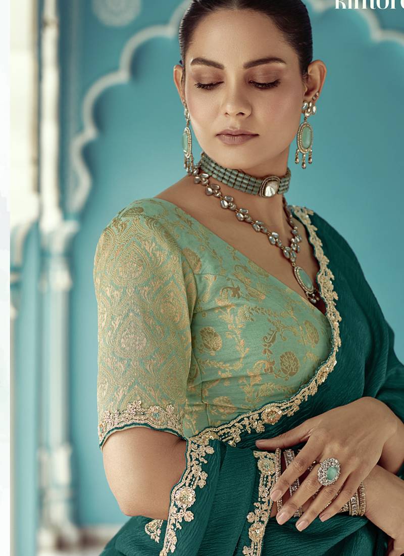 Peacock green glass tissue embroidery & sequence work designer saree
