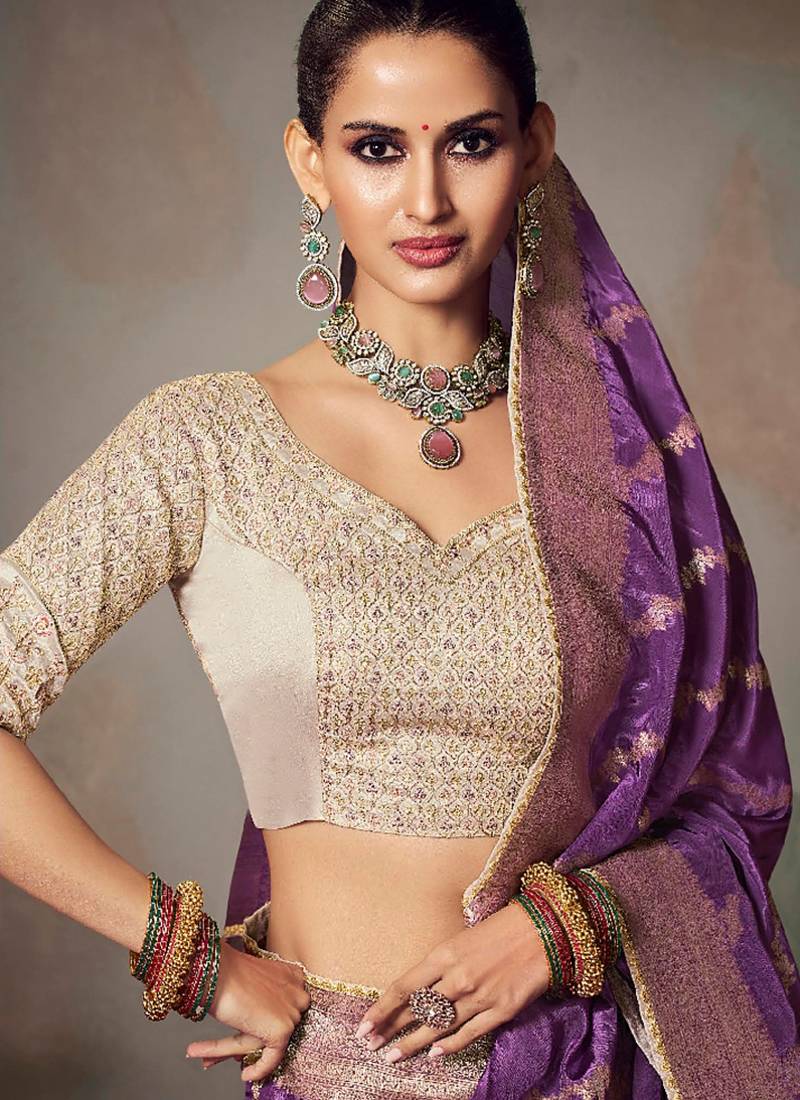 Purplw chiniya silk blend saree heavy designer embroidered blouse