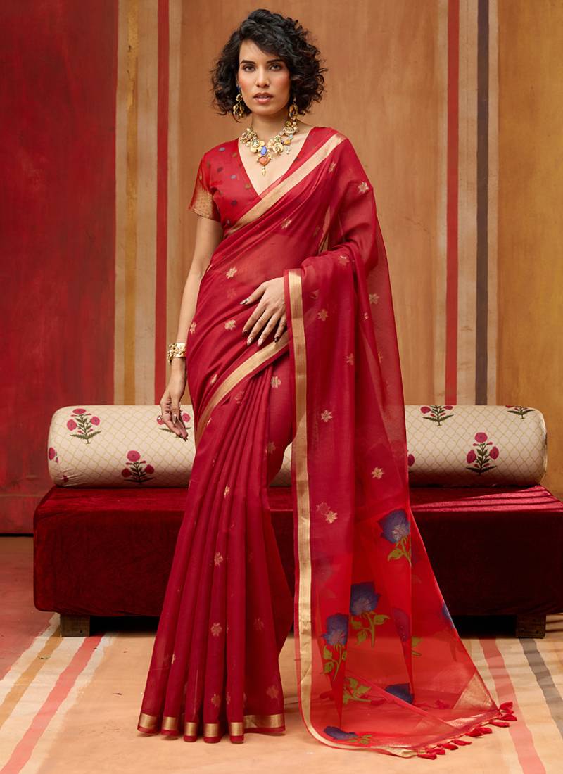 Red munga cotton handloom weaving organza weaving pallu traditional wear saree