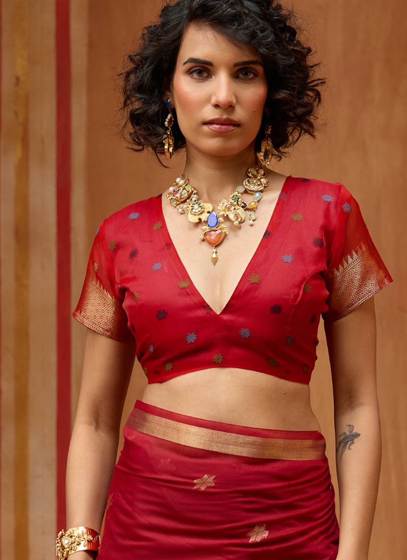 | Product Name | Red Munga Cotton Handloom Weaving Organza Weaving Pallu Traditional Wear Saree | |