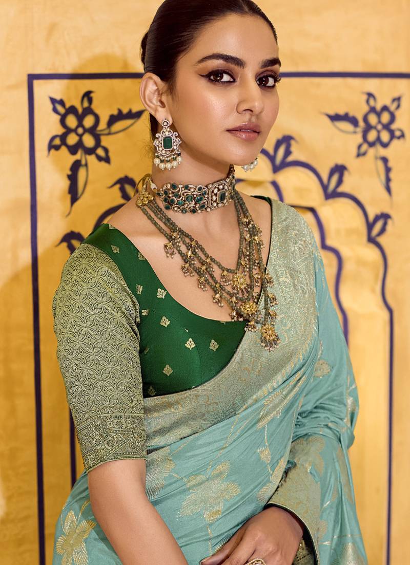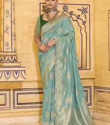 Turquoise crepe silk saree, beautifully crafted with rich zari weaving
