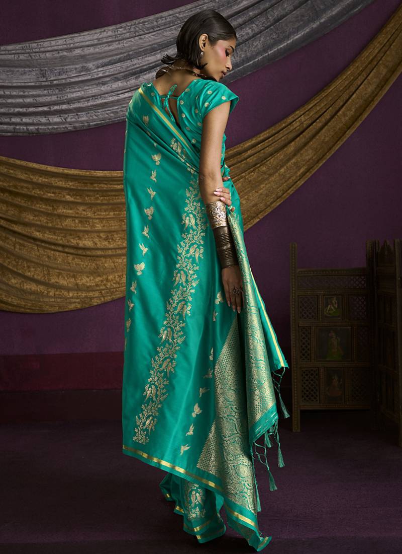 Turquoise pure satin handloom weaving silk saree with tussle pallu