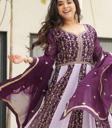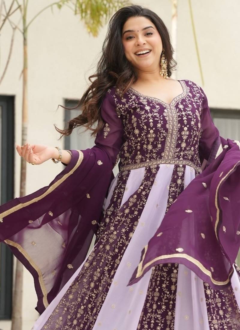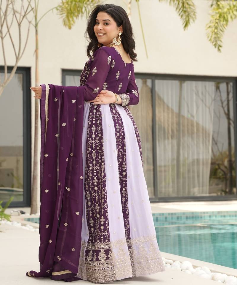 Indulge In Rich Elegance With This Luxurious Wine Colored Faux Blooming Embroidered Gown, Crafted For Those Who Love Premium Ethnic Wear With A Bold, Glamorous Touch. The Fabric’s Smooth Texture Paired With Intricate Multi Sequins Embroidery Gives This Gown A Sophisticated Festive Glow.