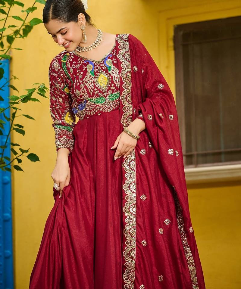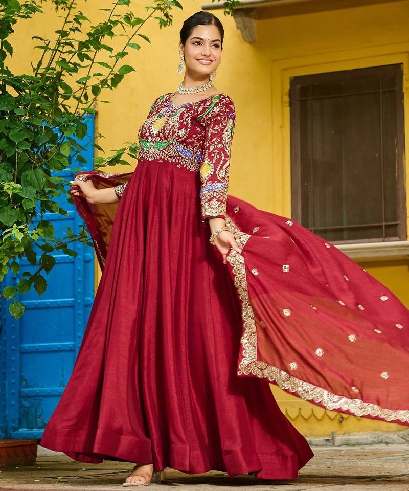 Maroon vichitra silk designer gown with zari embroidery | festive & wedding wear gown stitched
