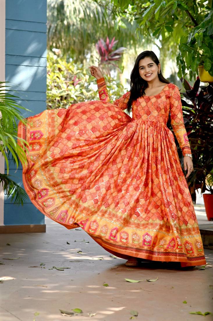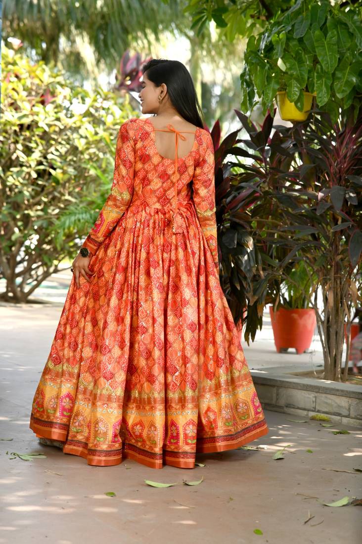 Orange chinnon printed semi-stitched gown with matching printed dupatta | lightweight & stylish ethnic wear semi stitched