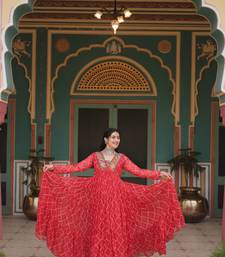 Orange faux blooming embroidered & printed gown festive & occasion wear semi stitched
