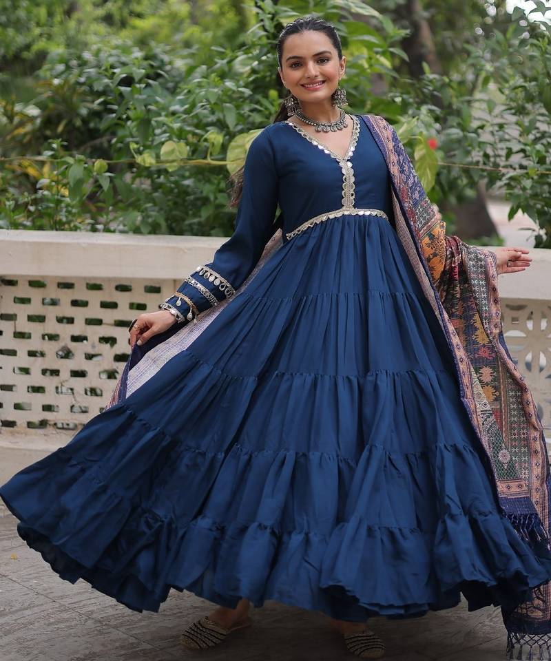 Step Into Effortless Elegance With This Rama Roman Fabric Semi Stitched Designer Gown, Crafted For Women Who Appreciate Premium Comfort And Rich Ethnic Detailing. The Soft Maslin Crochet Inner Enhances The Gown’s Structure, Ensuring A Smooth Silhouette And Luxurious Fall.