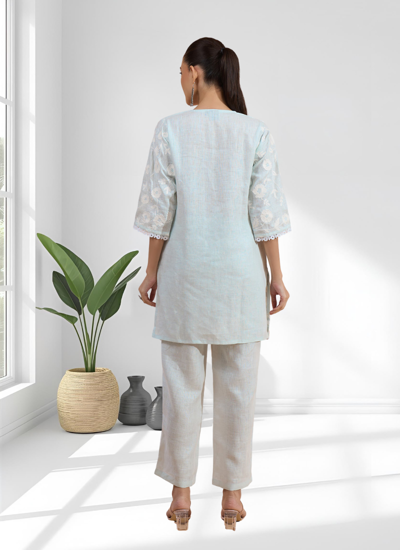 Powder blue linen short kurta with pant for women's