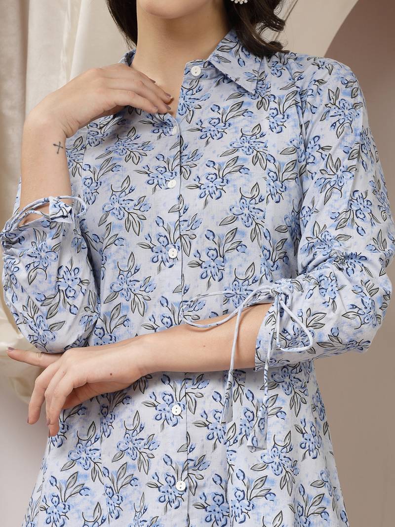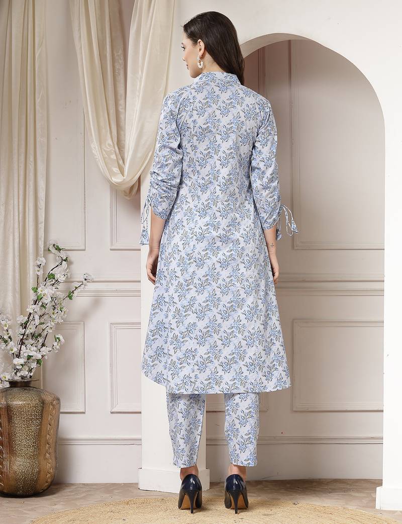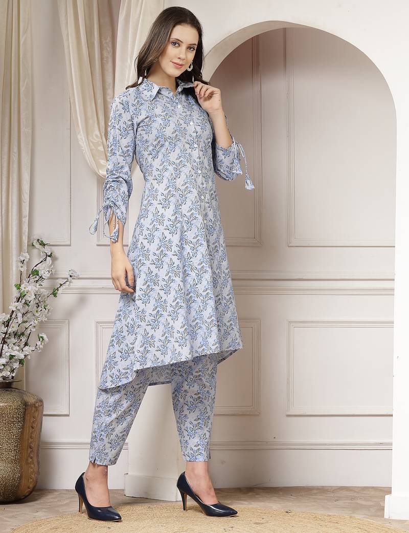 | Product Description | Women Cotton Blue Floral Print Co Ord Set, Has A Shirt Collar With Front Button Closure, Panelled A Line High Low Kurta With Three Quarter Tie Up Dori Sleeve, Calf Length Co Ord Set |