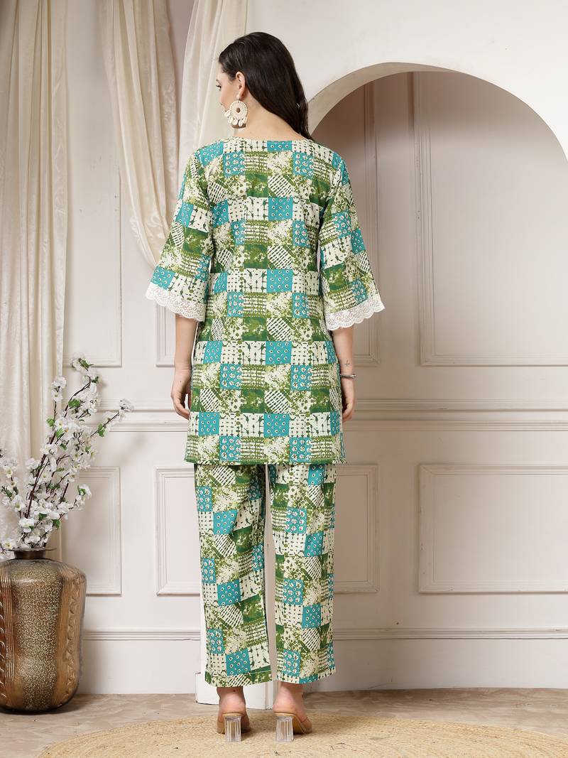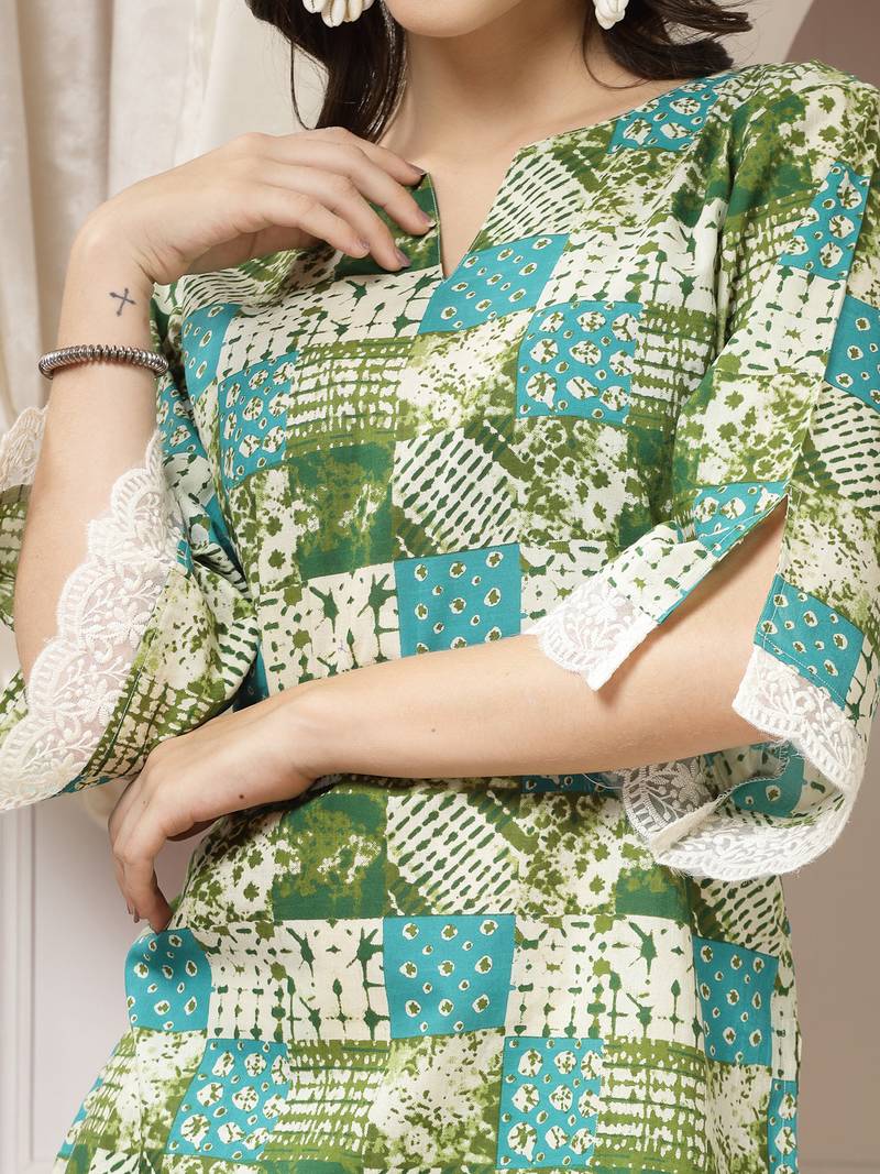 | Product Description | Women Cotton Green Abstract Print Co Ord Set, Has A Keyhole Neck With Three Quarter A Line Slit Sleeve And Organza Lace Detailing At Edge, Straight Hemline Organza Lace Detail With Side Slit Co Ord Set |