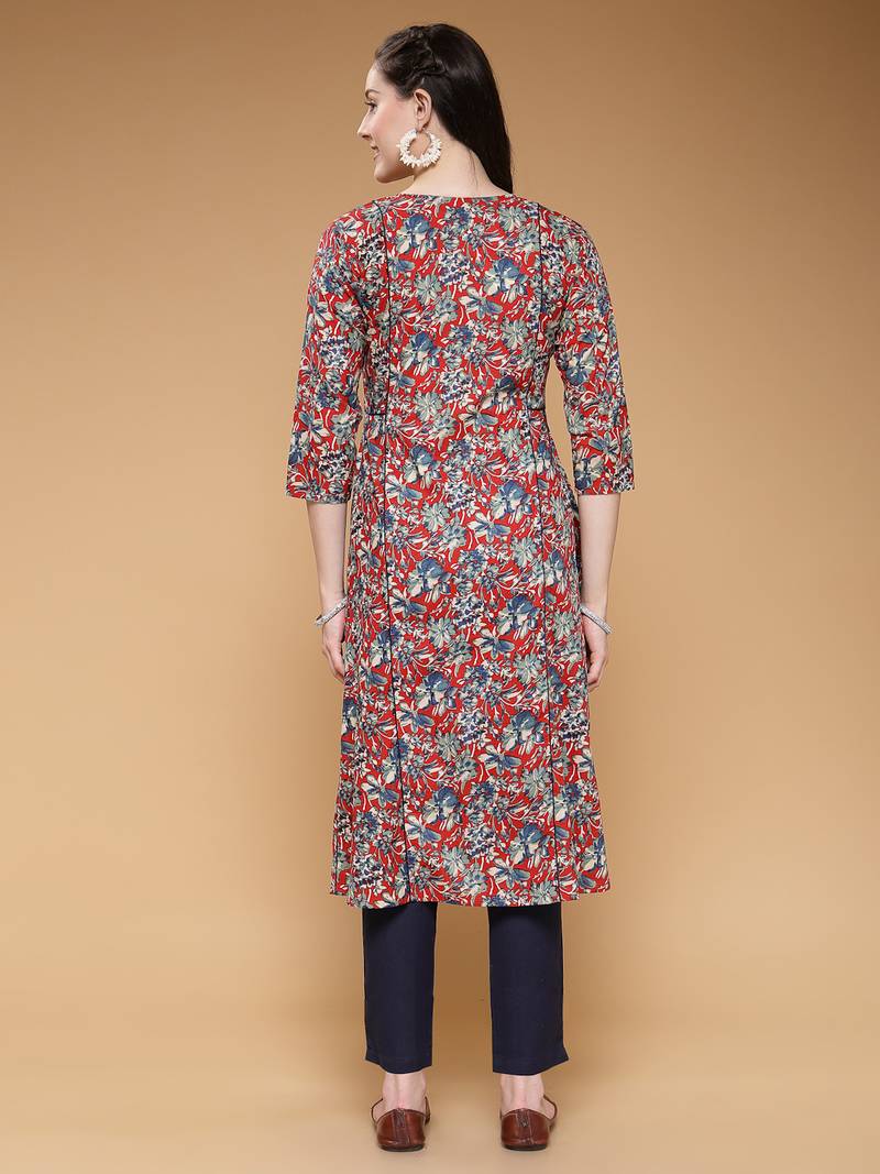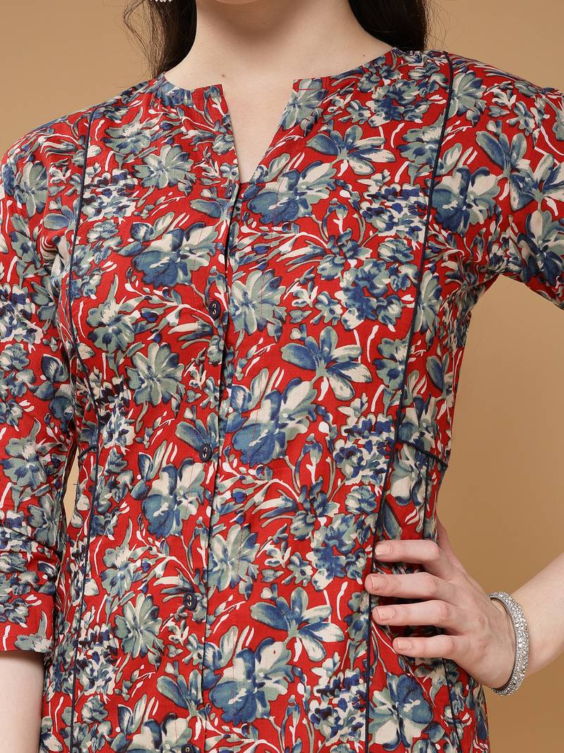 | Product Description | Women Cotton Maroon Floral Print A Line Kurta Set, Key Hole Neck Kurta With Front Button Closure, Contrast Dori Piping On Kali Of Kurta, Calf Length Kurta With Half Elasticated Trousers |