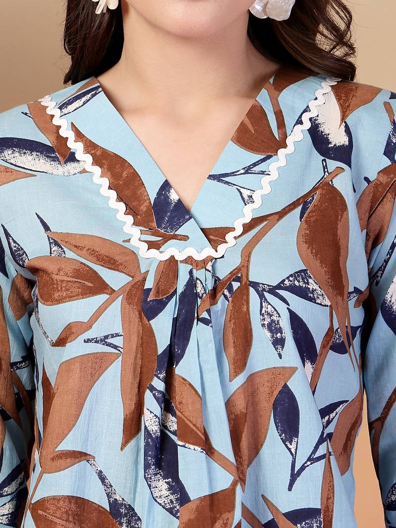 | Product Description | Indibelle Cotton Sky Blue Abstract Print V Neck Collar Neck With Lace Detailing, Front Gathers With Three Quarter Sleeve, Straight Trouser With Front Slit At Bottom, Mid Thigh Co Ord Set |