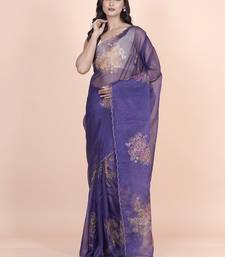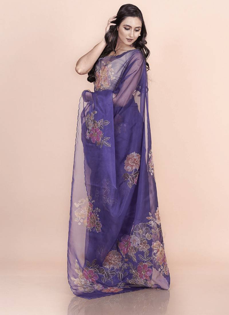 Blue coloured floral styled digital printed with hand pita work n. orgenza saree with blouse
