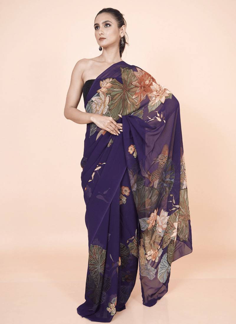 Purple coloured botanical floral styled digital printed georgette saree with blouse