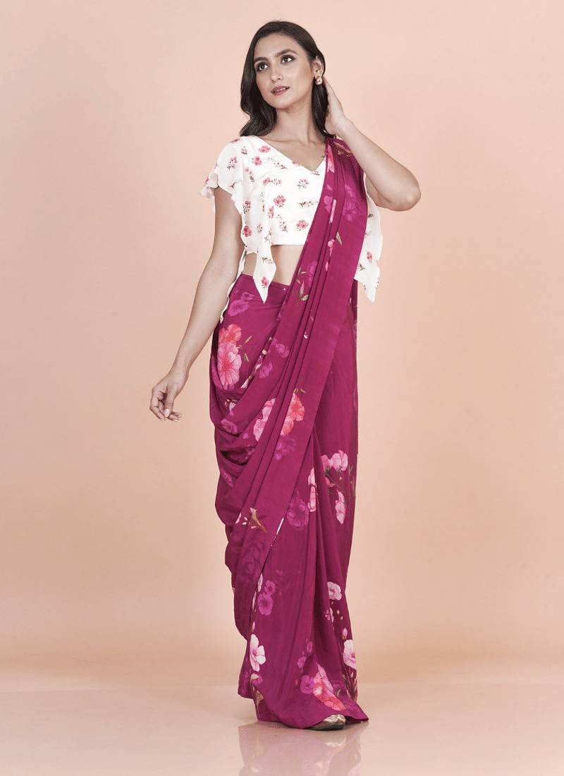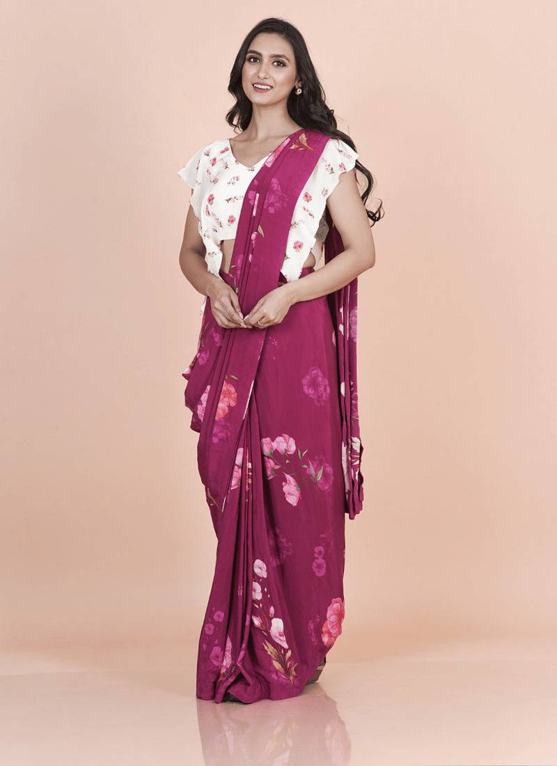 | Product Name | Wine Coloured Floral Styled Digital Printed Crepe Saree With Blouse | |