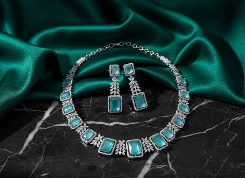 Product Name Zaveri Pearls Silver Plated Sea Green Stone Studded Jewellery Set