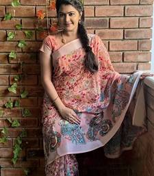 Peach printed pure cotton peach saree with blouse