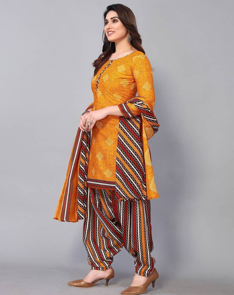 Unstitched printed cotton blend kurta & patiyala dress material with top, bottom & dupatta