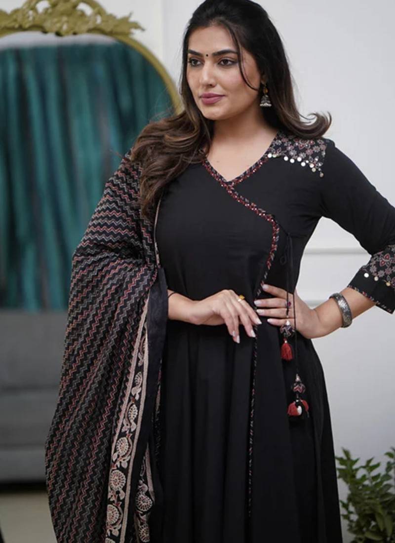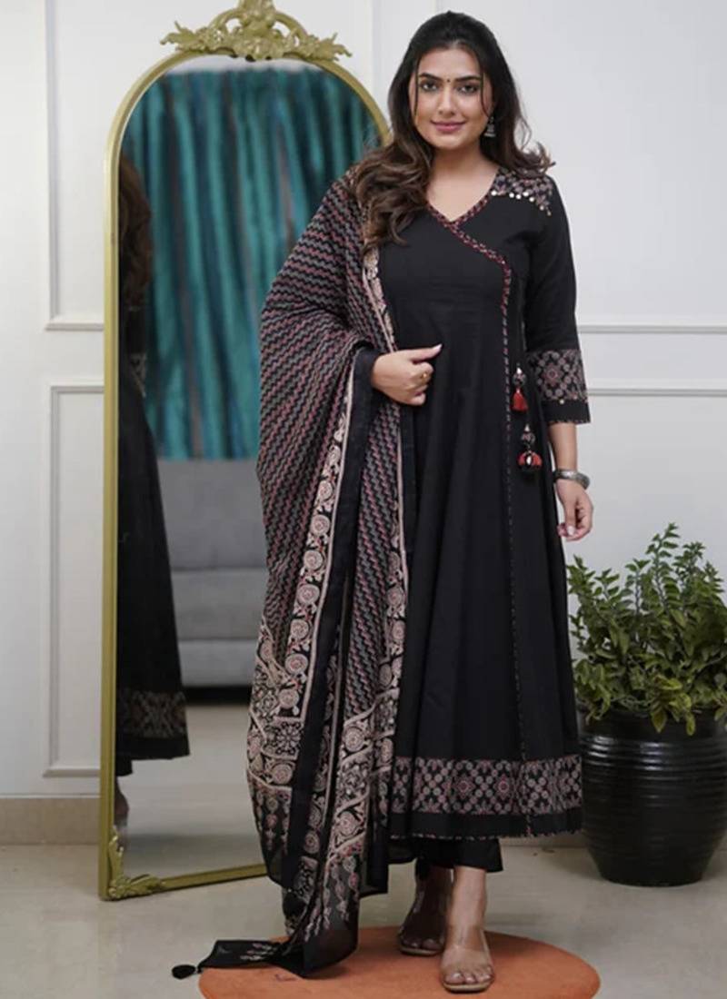 | Product Description | The Black Kurta Has A V Neck, An Angrakha Style (Wrap Around) Design With A Tie And A Tassel Accent, And 3/4 Sleeves. The Hem Of The Kurta Has A Detailed Ethnic Print Border In A Geometric Or Abstract Pattern. The Set Includes Matching Black Pants, Likely With An Elasticated Waistband For Comfort. The Outfit Is Completed With A Full Dupatta That Features A Print Matching The Kurta's Border Design. |