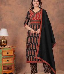 | Product Description | The Outfit Is A Traditional Indian Ethnic Wear Ensemble Featuring A Straight Cut Black Kurta (Tunic) With A Red And Black Paisley Print, A V Neck, And Three Quarter Length Sleeves. It Is Paired With Matching Black Trousers And A Black Dupatta (Scarf) Which Also Has A Red Border. |