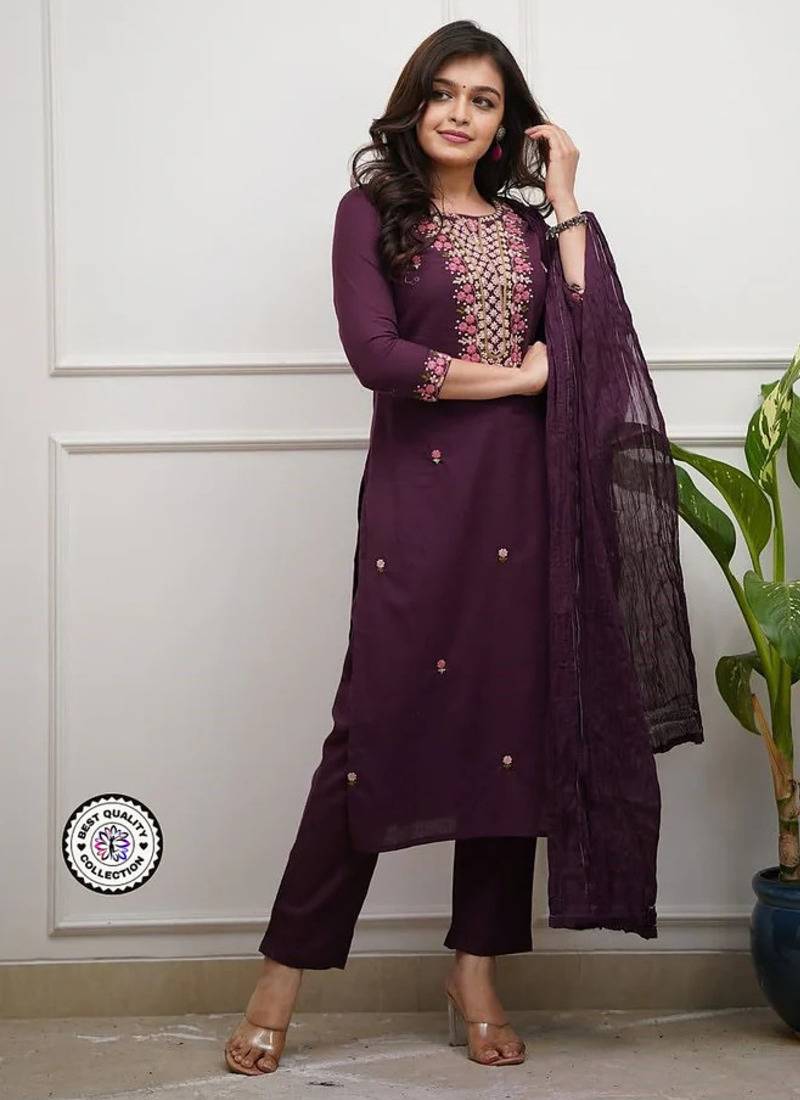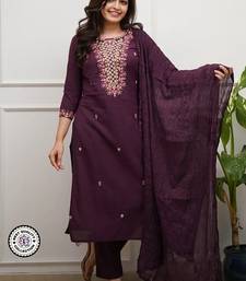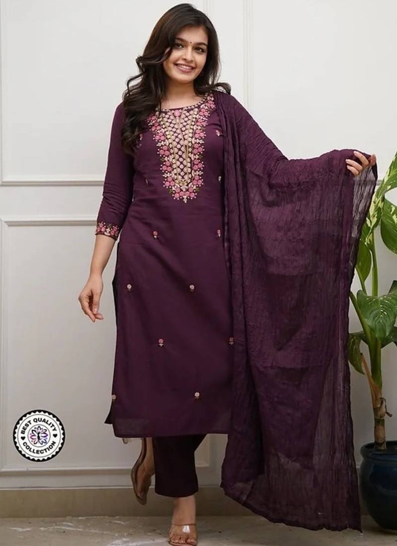 | Product Description | The Outfit Is A Straight Cut Kurta (Tunic) With A Round Neck, Paired With Matching Trousers (Salwar) And A Coordinating Dupatta (Scarf). The Sleeves Are Three Quarter Length. The Set Is A Rich, Solid Shade Of Purple Or Maroon. The Main Feature Is The Intricate Thread Work Embroidery Around The Neckline/Yoke, Which Includes Floral Or Ethnic Motifs. There Are Subtle Embroidered Motifs Scattered On The Rest Of The Kurta And Possibly The Dupatta's Borders. Material Is Comfortable Fabrics A Cotton Blend, Suitable For Various Occasions. |